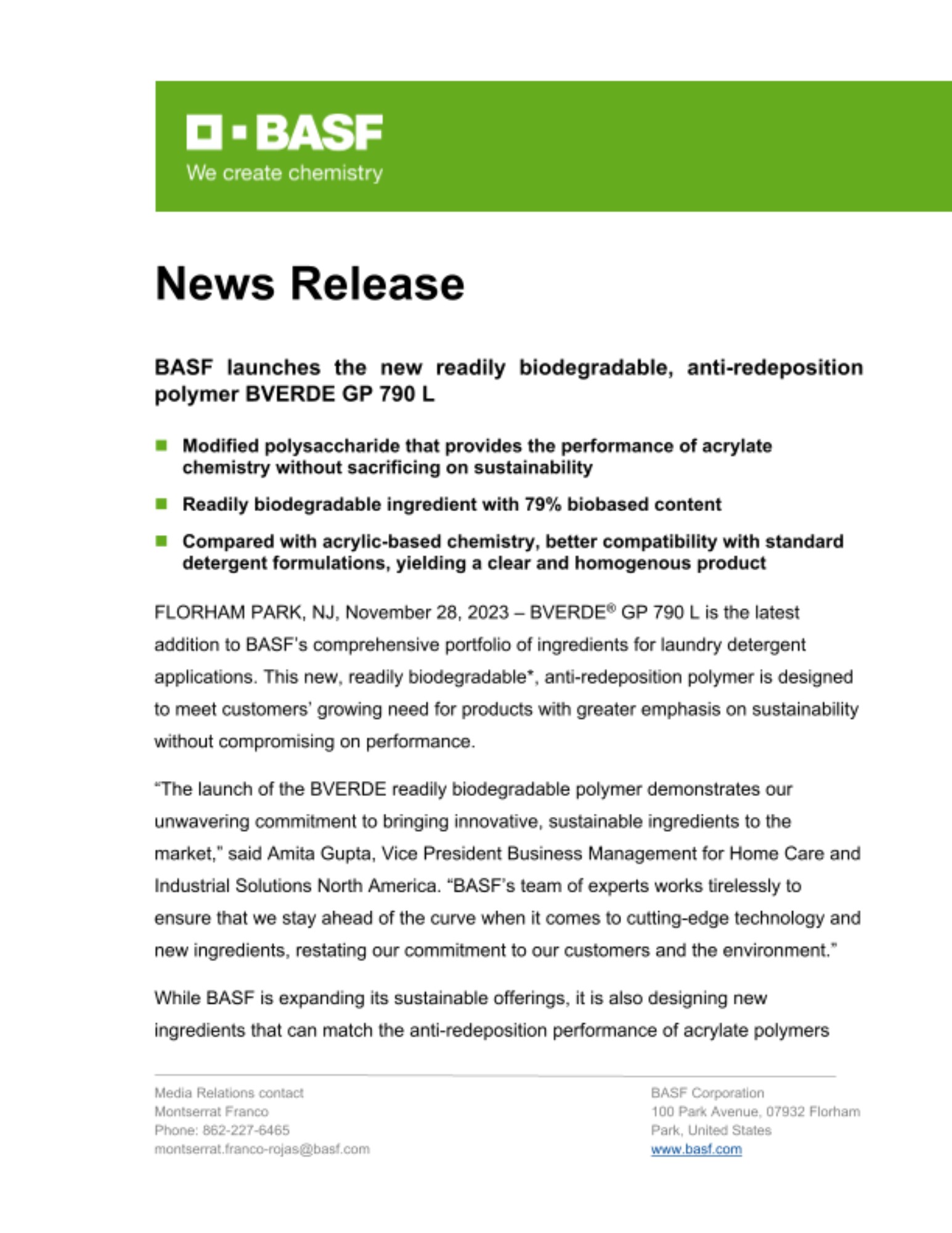 FLORHAM PARK, NJ, November 28, 2023 – BVERDE® GP 790 L is the latest addition to BASF’s comprehensive portfolio of ingredients for laundry detergent applications. This new, readily biodegradable*, anti-redeposition polymer is designed to meet customers’ growing need for products with greater emphasis on sustainability without compromising on performance.