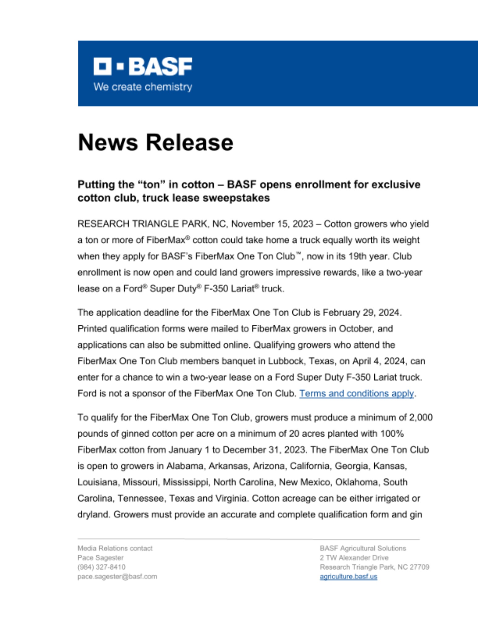RESEARCH TRIANGLE PARK, NC, November 15, 2023 – Cotton growers who yield a ton or more of FiberMax® cotton could take home a truck equally worth its weight when they apply for BASF’s FiberMax One Ton Club™, now in its 19th year. Club enrollment is now open and could land growers impressive rewards, like a two-year lease on a Ford® Super Duty® F-350 Lariat® truck.