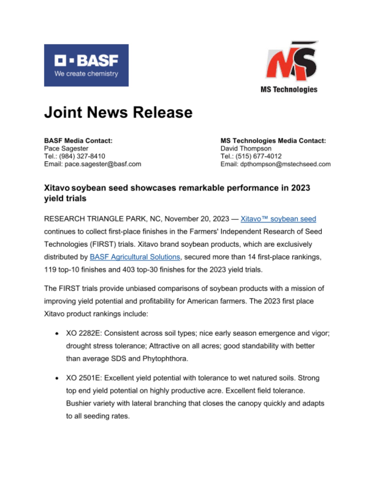 RESEARCH TRIANGLE PARK, NC, November 20, 2023 — Xitavo™ soybean seed continues to collect first-place finishes in the Farmers' Independent Research of Seed Technologies (FIRST) trials. Xitavo brand soybean products, which are exclusively distributed by BASF Agricultural Solutions, secured more than 14 first-place rankings, 119 top-10 finishes and 403 top-30 finishes for the 2023 yield trials.