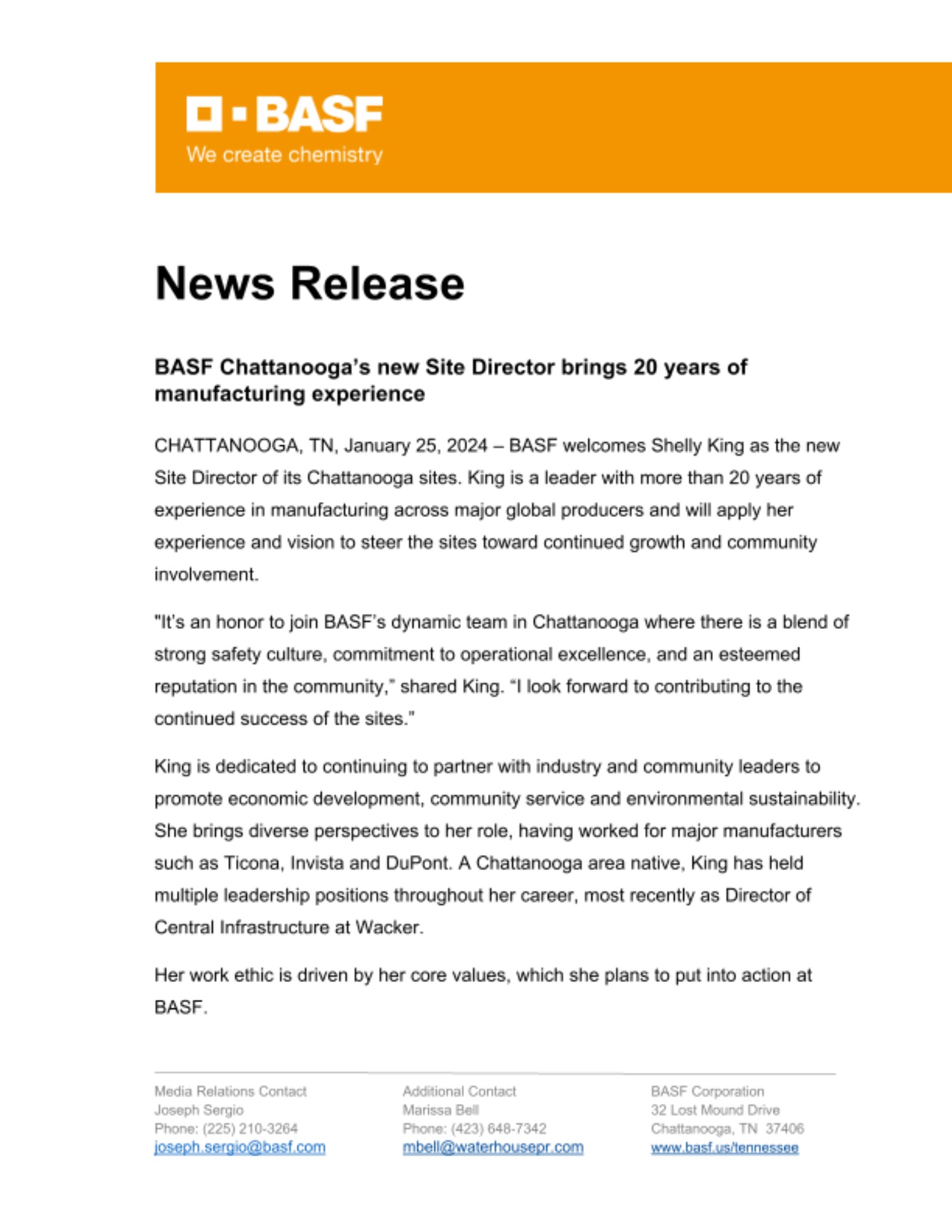 "It’s an honor to join BASF’s dynamic team in Chattanooga where there is a blend of strong safety culture, commitment to operational excellence, and an esteemed reputation in the community,” shared King. “I look forward to contributing to the continued success of the sites.”