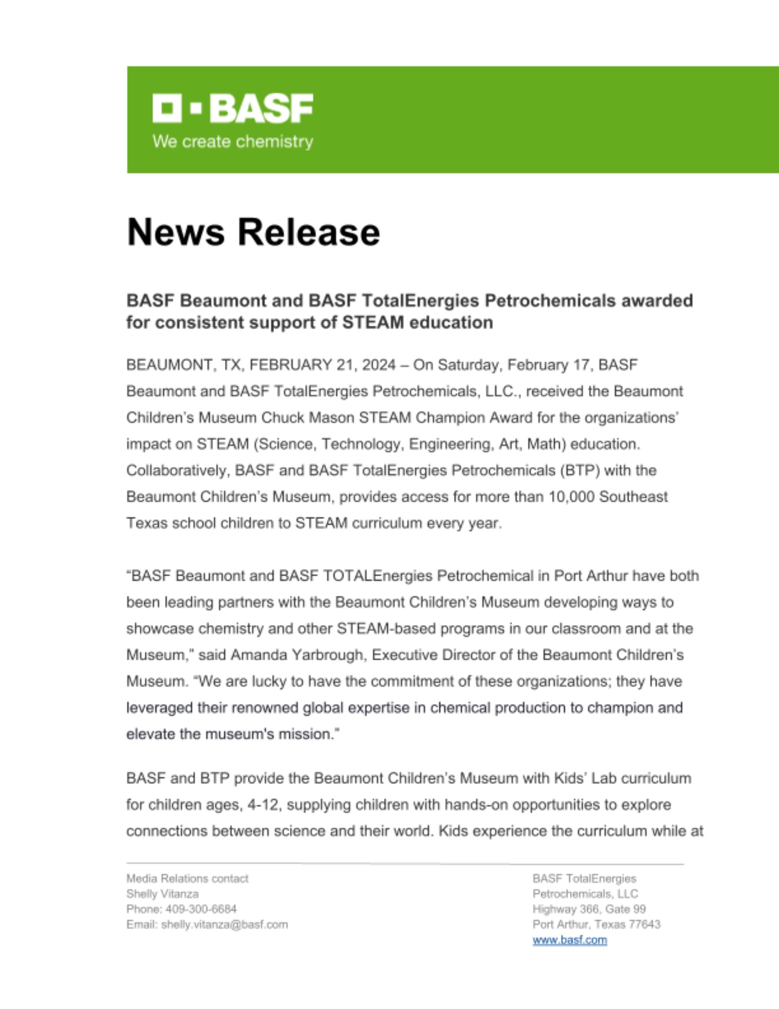 BEAUMONT, TX, FEBRUARY 21, 2024 – On Saturday, February 17, BASF Beaumont and BASF TotalEnergies Petrochemicals, LLC., received the Beaumont Children’s Museum Chuck Mason STEAM Champion Award for the organizations’ impact on STEAM (Science, Technology, Engineering, Art, Math) education. Collaboratively, BASF and BASF TotalEnergies Petrochemicals (BTP) with the Beaumont Children’s Museum, provides access for more than 10,000 Southeast Texas school children to STEAM curriculum every year.