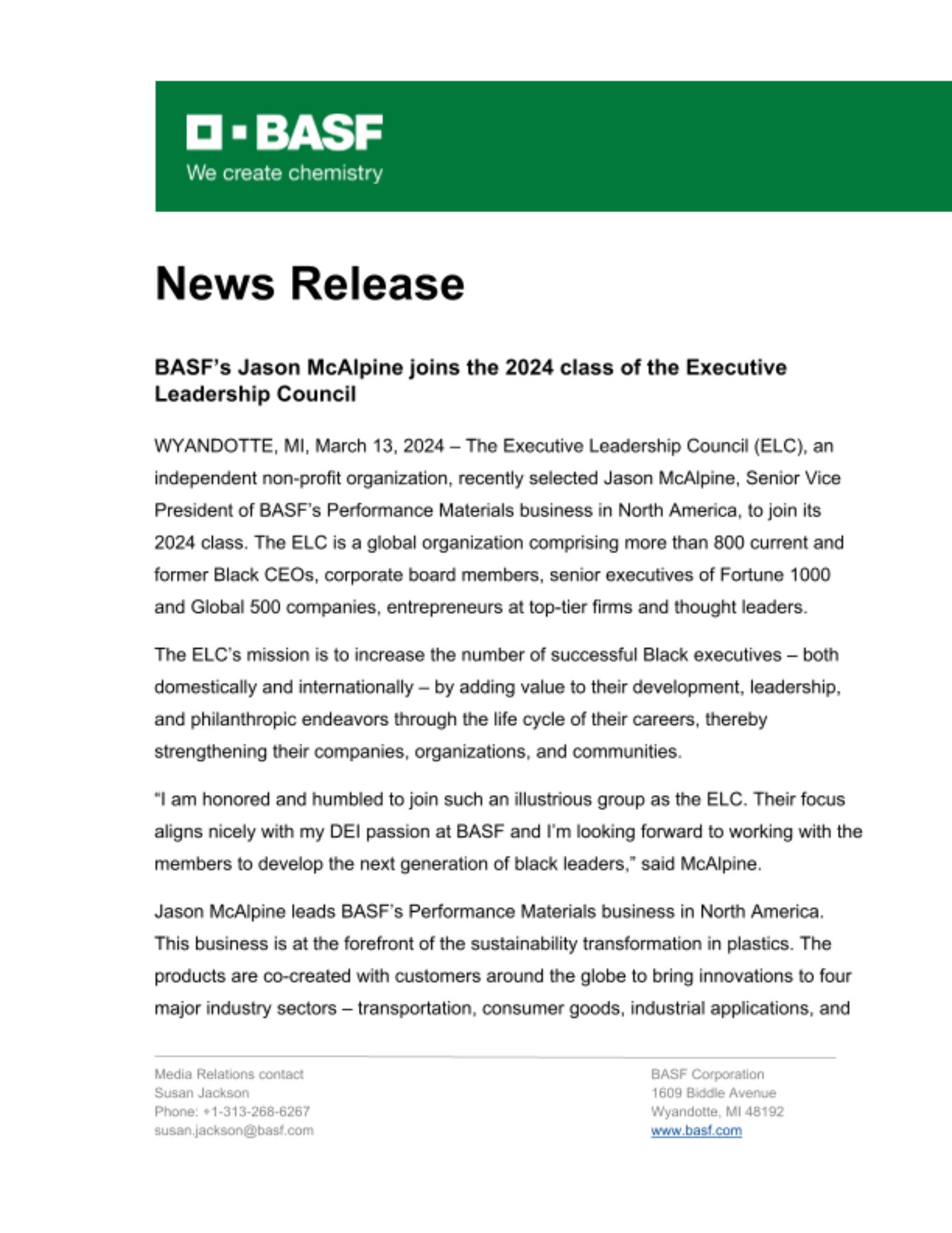 WYANDOTTE, MI, March 13, 2024 – The Executive Leadership Council (ELC), an independent non-profit organization, recently selected Jason McAlpine, Senior Vice President of BASF’s Performance Materials business in North America, to join its 2024 class. The ELC is a global organization comprising more than 800 current and former Black CEOs, corporate board members, senior executives of Fortune 1000 and Global 500 companies, entrepreneurs at top-tier firms and thought leaders.