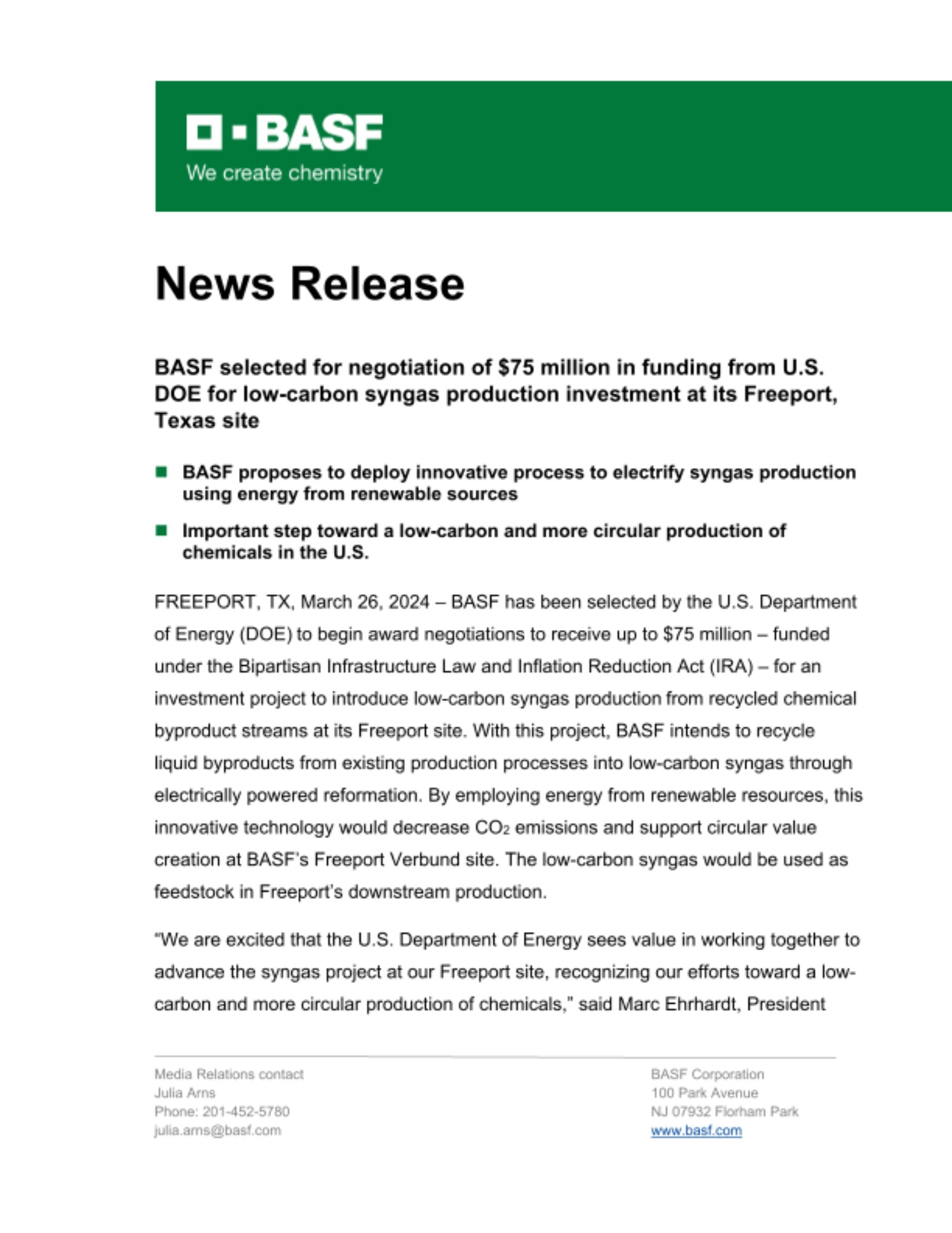 FREEPORT, TX, March 26, 2024 – BASF has been selected by the U.S. Department of Energy (DOE) to begin award negotiations to receive up to $75 million – funded under the Bipartisan Infrastructure Law and Inflation Reduction Act (IRA) – for an investment project to introduce low-carbon syngas production from recycled chemical byproduct streams at its Freeport site. With this project, BASF intends to recycle liquid byproducts from existing production processes into low-carbon syngas through electrically powered reformation. By employing energy from renewable resources, this innovative technology would decrease CO2 emissions and support circular value creation at BASF's Freeport Verbund site. The low-carbon syngas would be used as feedstock in Freeport’s downstream production.