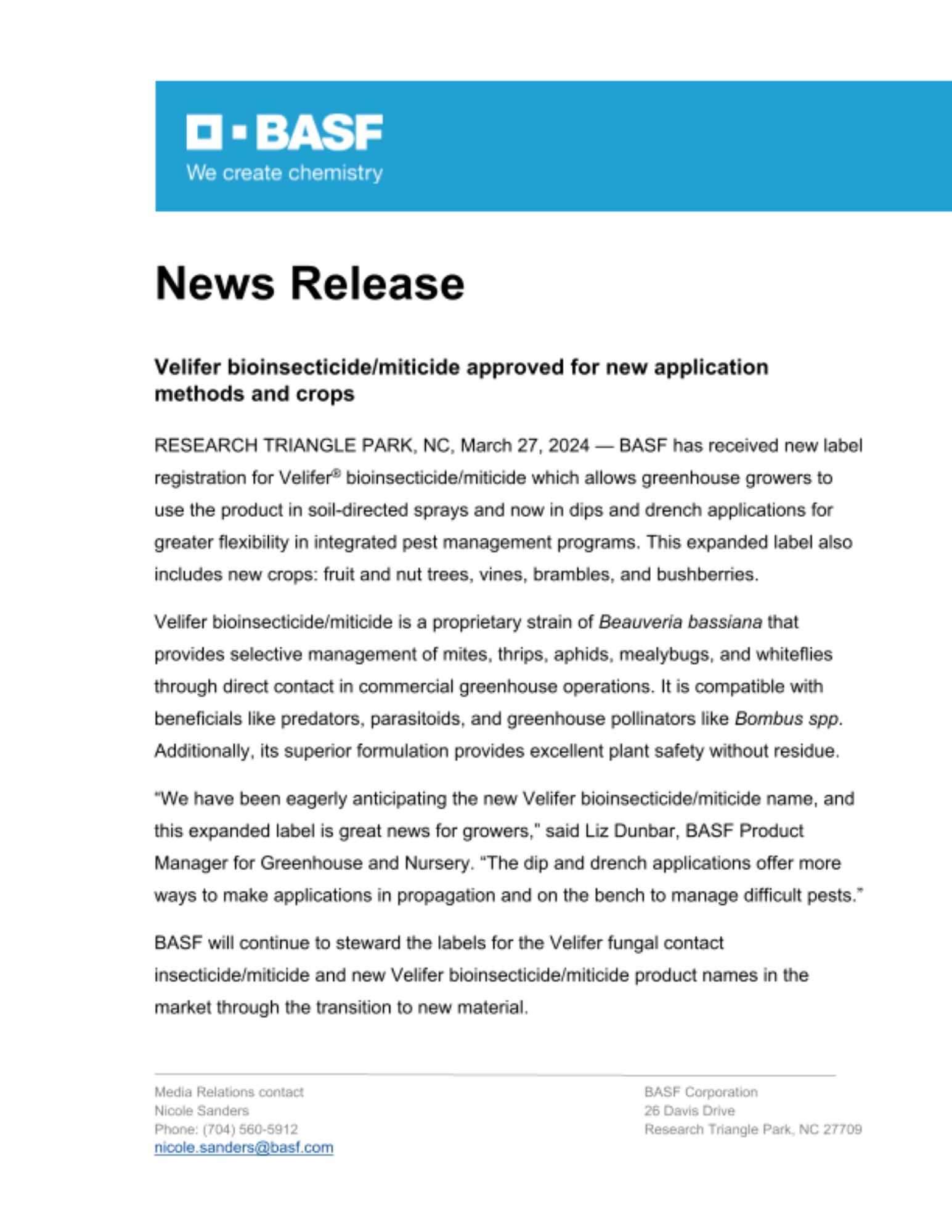 RESEARCH TRIANGLE PARK, NC, March 27, 2024 — BASF has received new label registration for Velifer® bioinsecticide/miticide which allows greenhouse growers to use the product in soil-directed sprays and now in dips and drench applications for greater flexibility in integrated pest management programs. This expanded label also includes new crops: fruit and nut trees, vines, brambles, and bushberries.