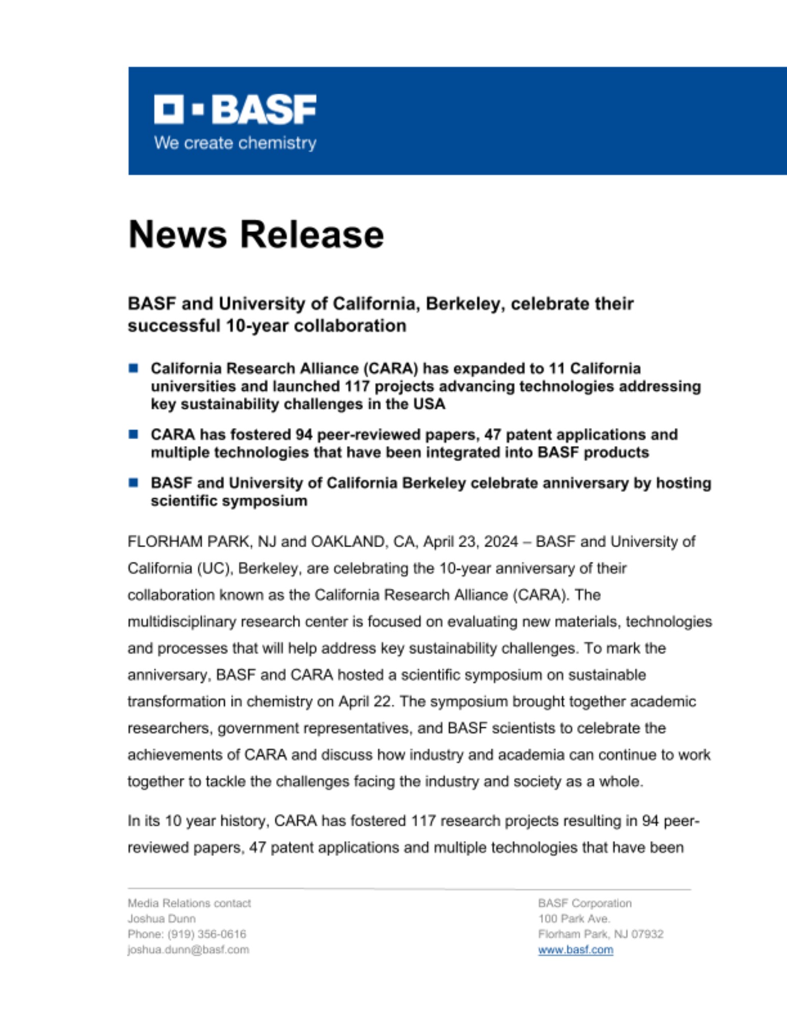 FLORHAM PARK, NJ and OAKLAND, CA, April 23, 2024 – BASF and University of California (UC), Berkeley, are celebrating the 10-year anniversary of their collaboration known as the California Research Alliance (CARA). The multidisciplinary research center is focused on evaluating new materials, technologies and processes that will help address key sustainability challenges. To mark the anniversary, BASF and CARA hosted a scientific symposium on sustainable transformation in chemistry on April 22. The symposium brought together academic researchers, government representatives, and BASF scientists to celebrate the achievements of CARA and discuss how industry and academia can continue to work together to tackle the challenges facing the industry and society as a whole.