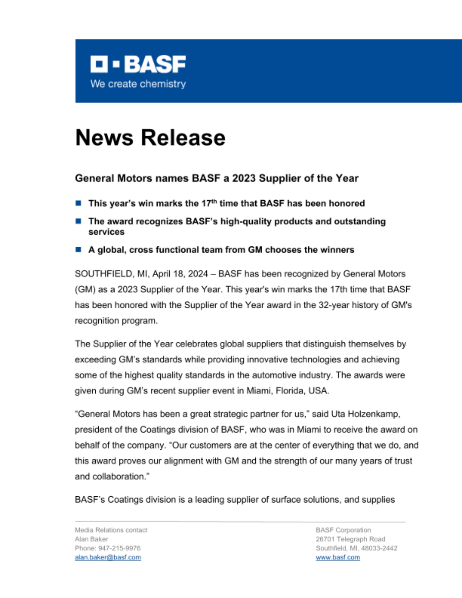 SOUTHFIELD, MI, April 18, 2024 – BASF has been recognized by General Motors (GM) as a 2023 Supplier of the Year. This year's win marks the 17th time that BASF has been honored with the Supplier of the Year award in the 32-year history of GM's recognition program.