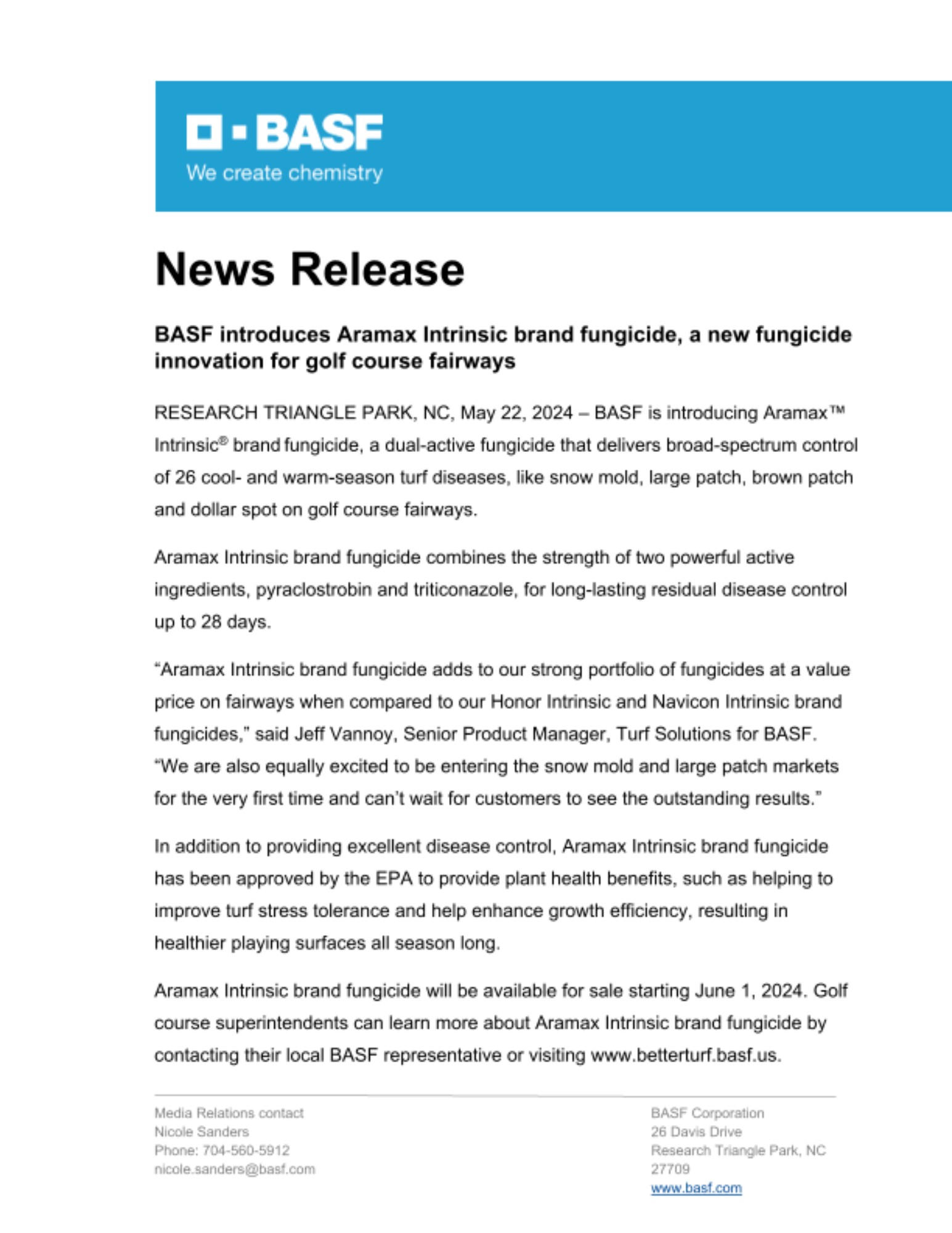 Aramax Intrinsic brand fungicide will be available for sale starting June 1, 2024. Golf course superintendents can learn more about Aramax Intrinsic brand fungicide by contacting their local BASF representative or visiting www.betterturf.basf.us.
