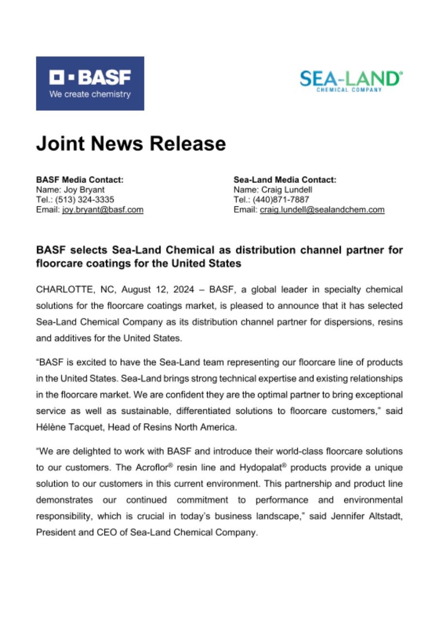 CHARLOTTE, NC, August 12, 2024 – BASF, a global leader in specialty chemical solutions for the floorcare coatings market, is pleased to announce that it has selected Sea-Land Chemical Company as its distribution channel partner for dispersions, resins and additives for the United States.