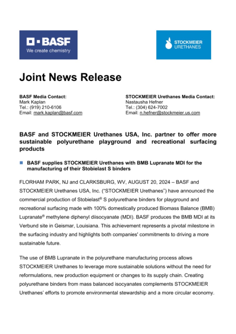 "With playground season in full swing across North America, we are excited to team with BASF and become the first U.S. polyurethane pour-in-place (PIP) binder manufacturer to forge a domestic partnership over BASF’s BMB isocyanates," said Christian Martinkat, President and CEO of STOCKMEIER Urethanes USA, Inc. "This collaboration marks a significant advancement toward enhancing product innovation and expanding manufacturing capabilities in the surfacing industry. We can take a big step toward greater sustainability of our products by offering a version of our high-quality PIP binders produced with renewable feedstock-based MDI. This partnership advances our goal of reducing STOCKMEIER Urethanes' carbon footprint worldwide."