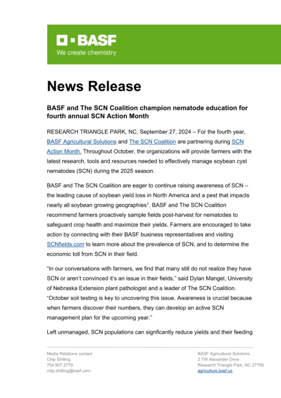 RESEARCH TRIANGLE PARK, NC, September 27, 2024 – For the fourth year, BASF Agricultural Solutions and The SCN Coalition are partnering during SCN Action Month. Throughout October, the organizations will provide farmers with the latest research, tools and resources needed to effectively manage soybean cyst nematodes (SCN) during the 2025 season.