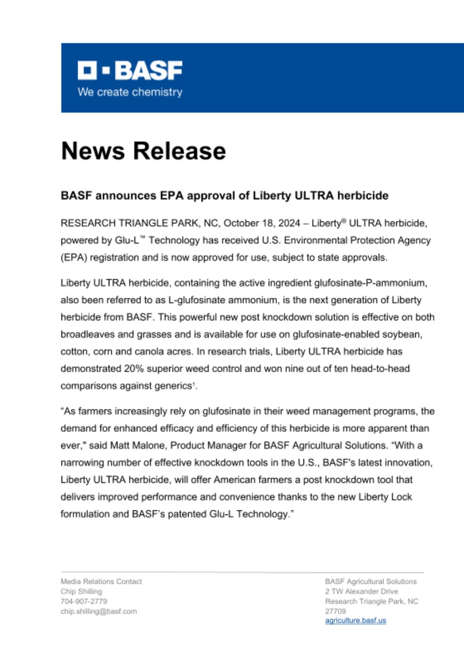 “As farmers increasingly rely on glufosinate in their weed management programs, the demand for enhanced efficacy and efficiency of this herbicide is more apparent than ever," said Matt Malone, Product Manager for BASF Agricultural Solutions. “With a narrowing number of effective knockdown tools in the U.S., BASF's latest innovation, Liberty ULTRA herbicide, will offer American farmers a post knockdown tool that delivers improved performance and convenience thanks to the new Liberty Lock formulation and BASF’s patented Glu-L Technology.”
