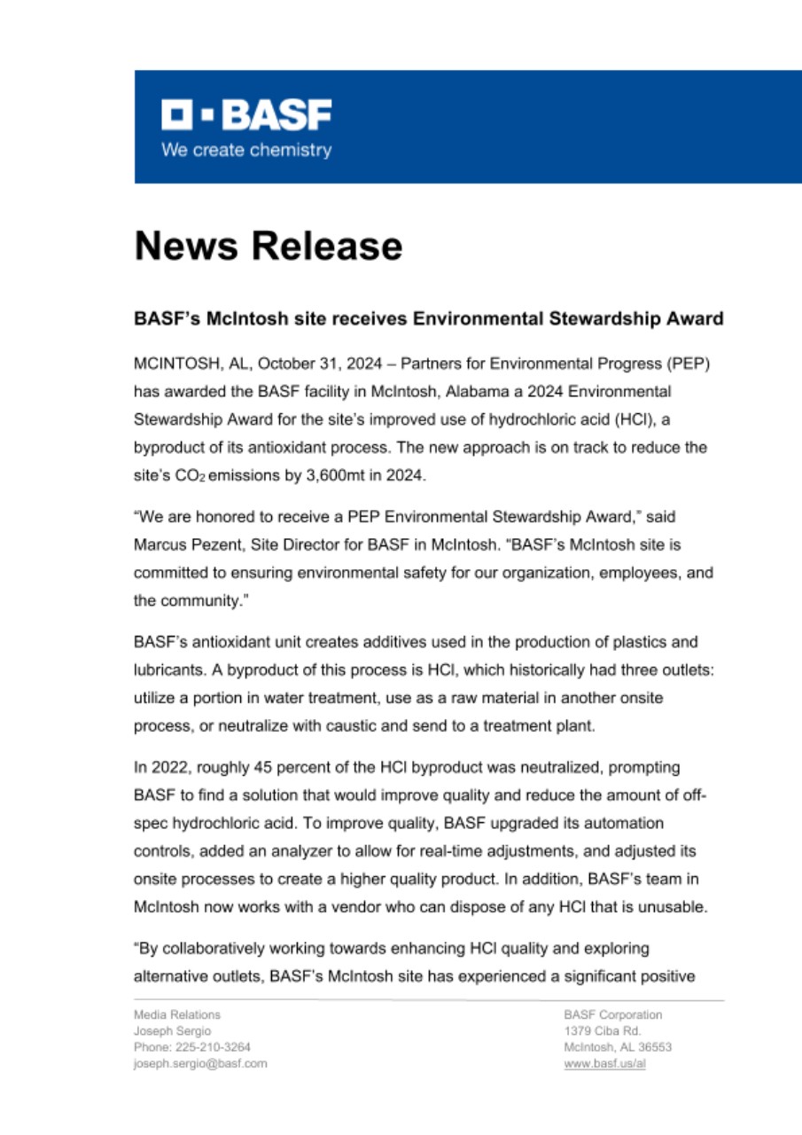 MCINTOSH, AL, October 31, 2024 – Partners for Environmental Progress (PEP) has awarded the BASF facility in McIntosh, Alabama a 2024 Environmental Stewardship Award for the site’s improved use of hydrochloric acid (HCl), a byproduct of its antioxidant process. The new approach is on track to reduce the site’s CO2 emissions by 3,600mt in 2024.