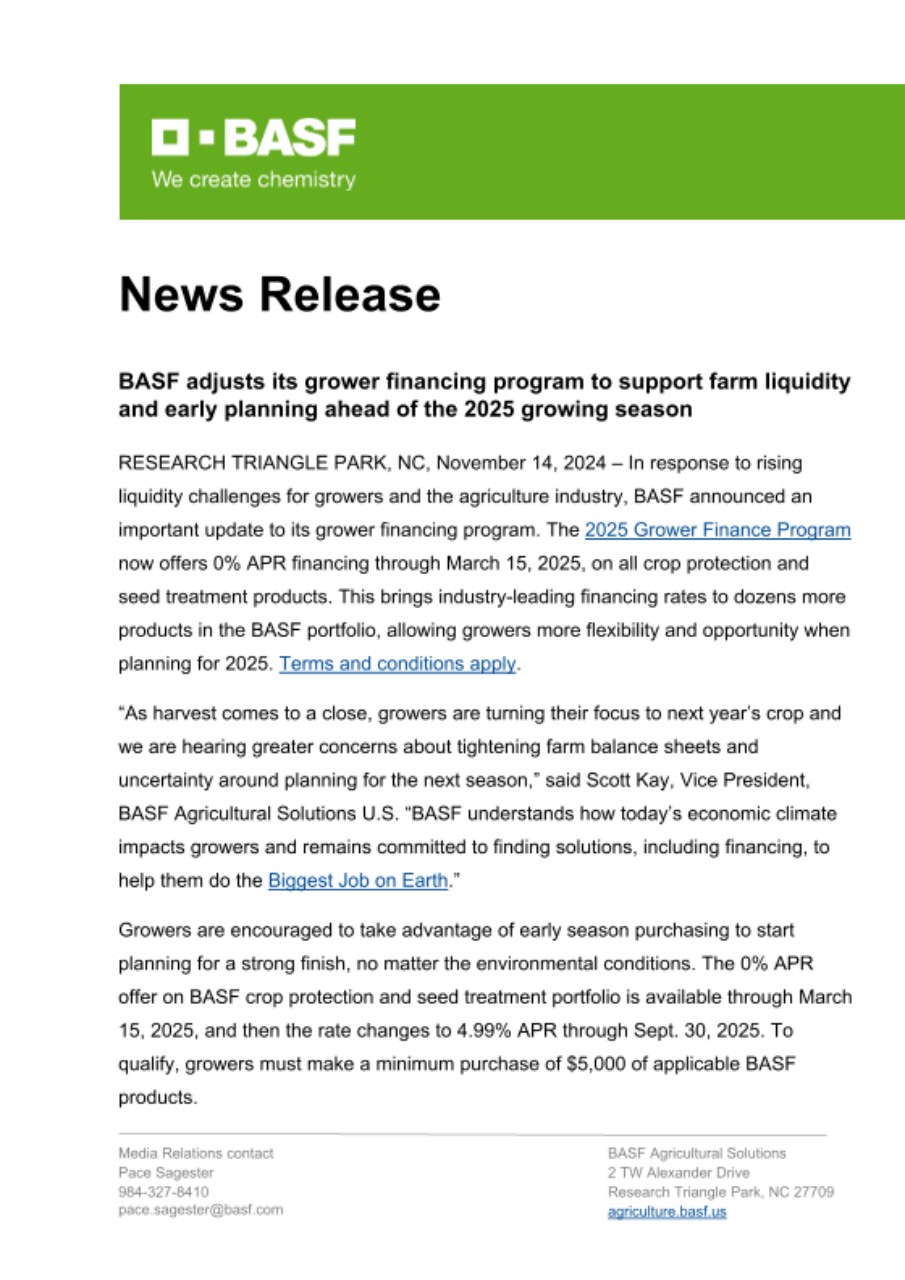 RESEARCH TRIANGLE PARK, NC, November 14, 2024 – In response to rising liquidity challenges for growers and the agriculture industry, BASF announced an important update to its grower financing program. The 2025 Grower Finance Program now offers 0% APR financing through March 15, 2025, on all crop protection and seed treatment products. This brings industry-leading financing rates to dozens more products in the BASF portfolio, allowing growers more flexibility and opportunity when planning for 2025. Terms and conditions apply.