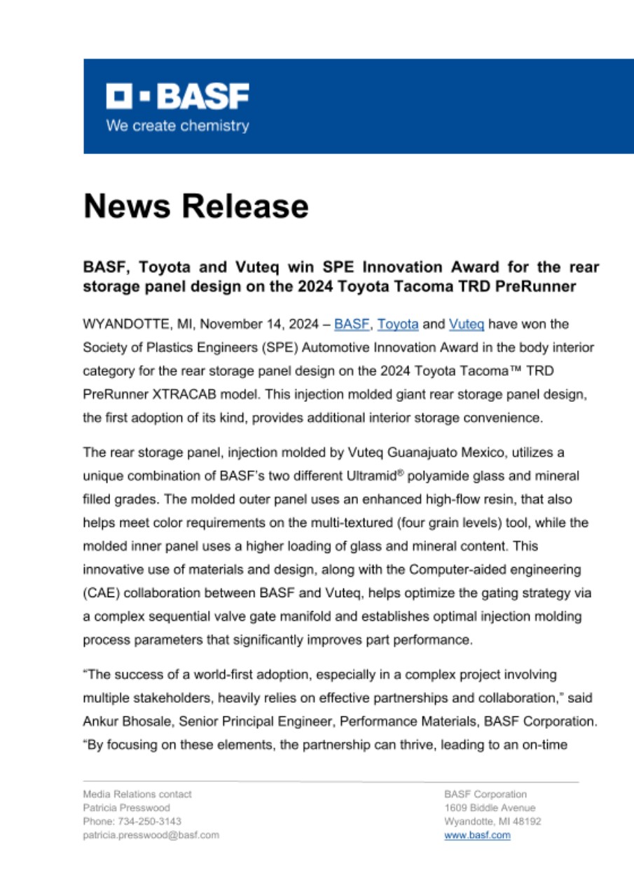 WYANDOTTE, MI, November 14, 2024 – BASF, Toyota and Vuteq have won the Society of Plastics Engineers (SPE) Automotive Innovation Award in the body interior category for the rear storage panel design on the 2024 Toyota Tacoma™ TRD PreRunner XTRACAB model. This injection molded giant rear storage panel design, the first adoption of its kind, provides additional interior storage convenience.
