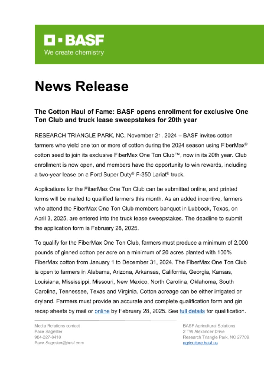 RESEARCH TRIANGLE PARK, NC, November 21, 2024 – BASF invites cotton farmers who yield one ton or more of cotton during the 2024 season using FiberMax® cotton seed to join its exclusive FiberMax One Ton Club™, now in its 20th year. Club enrollment is now open, and members have the opportunity to win rewards, including a two-year lease on a Ford Super Duty® F-350 Lariat® truck.