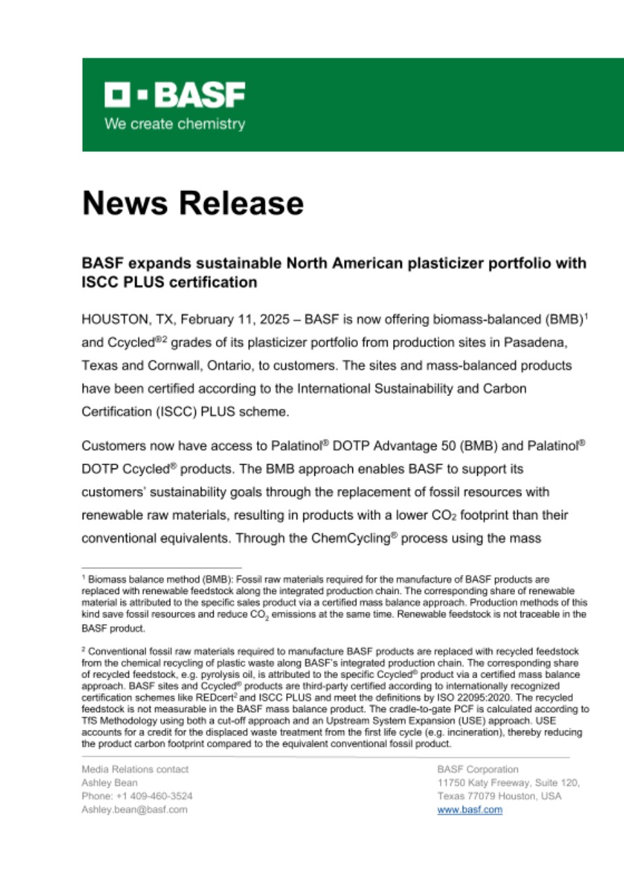 HOUSTON, TX, February 11, 2025 – BASF is now offering biomass-balanced (BMB)[1] and Ccycled®[2] grades of its plasticizer portfolio from production sites in Pasadena, Texas and Cornwall, Ontario, to customers. The sites and mass-balanced products have been certified according to the International Sustainability and Carbon Certification (ISCC) PLUS scheme.