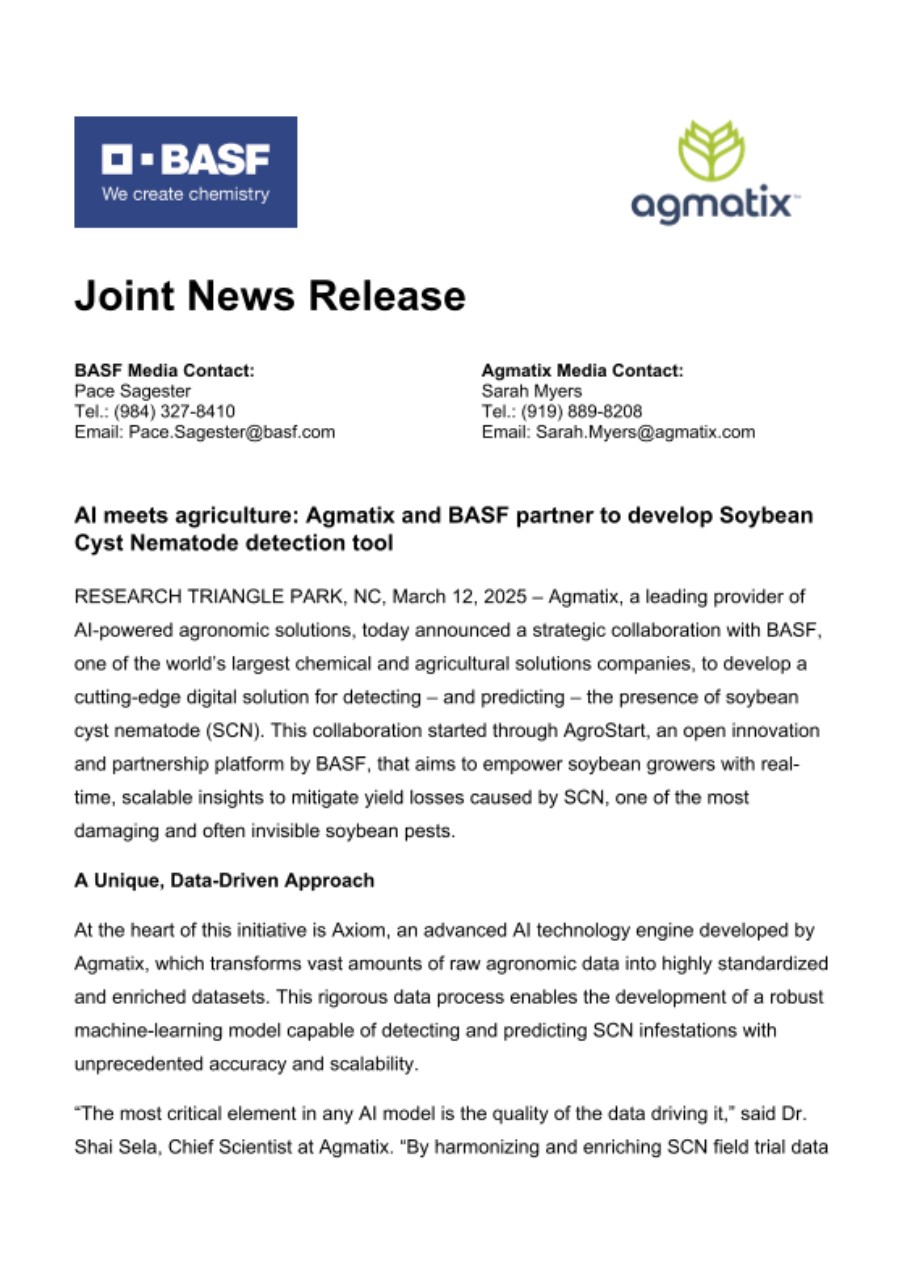 RESEARCH TRIANGLE PARK, NC, March 12, 2025 – Agmatix, a leading provider of AI-powered agronomic solutions, today announced a strategic collaboration with BASF, one of the world’s largest chemical and agricultural solutions companies, to develop a cutting-edge digital solution for detecting – and predicting – the presence of soybean cyst nematode (SCN). This collaboration started through AgroStart, an open innovation and partnership platform by BASF, that aims to empower soybean growers with real-time, scalable insights to mitigate yield losses caused by SCN, one of the most damaging and often invisible soybean pests.
