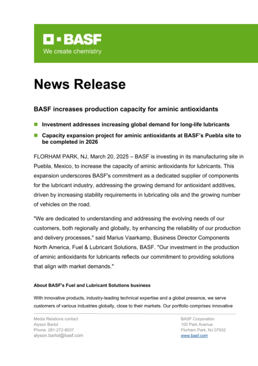 FLORHAM PARK, NJ, March 20, 2025 – BASF is investing in its manufacturing site in Puebla, Mexico, to increase the capacity of aminic antioxidants for lubricants. This expansion underscores BASF's commitment as a dedicated supplier of components for the lubricant industry, addressing the growing demand for antioxidant additives, driven by increasing stability requirements in lubricating oils and the growing number of vehicles on the road.