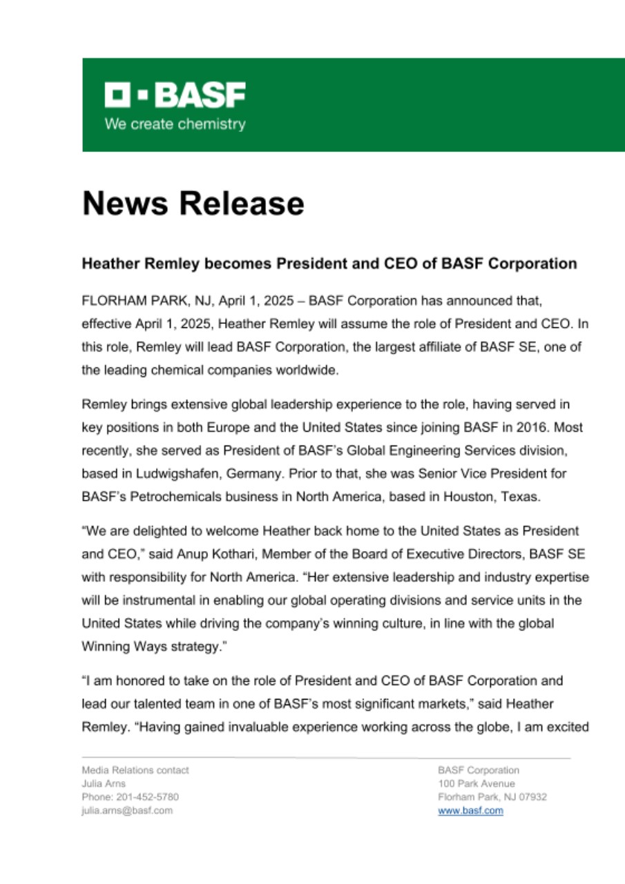 FLORHAM PARK, NJ, April 1, 2025 – BASF Corporation has announced that, effective April 1, 2025, Heather Remley will assume the role of President and CEO. In this role, Remley will lead BASF Corporation, the largest affiliate of BASF SE, one of the leading chemical companies worldwide.