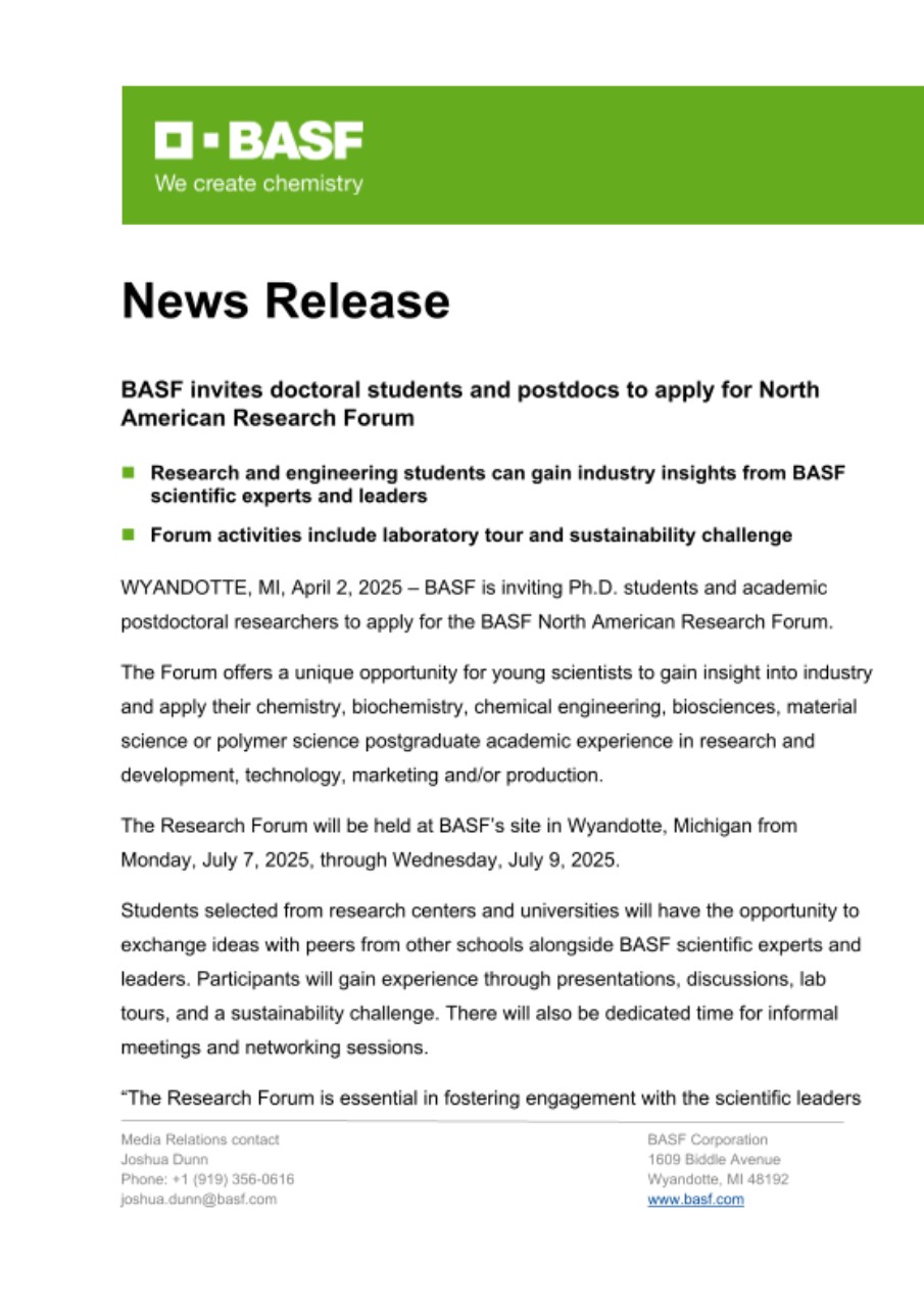 WYANDOTTE, MI, April 2, 2025 – BASF is inviting Ph.D. students and academic postdoctoral researchers to apply for the BASF North American Research Forum.
