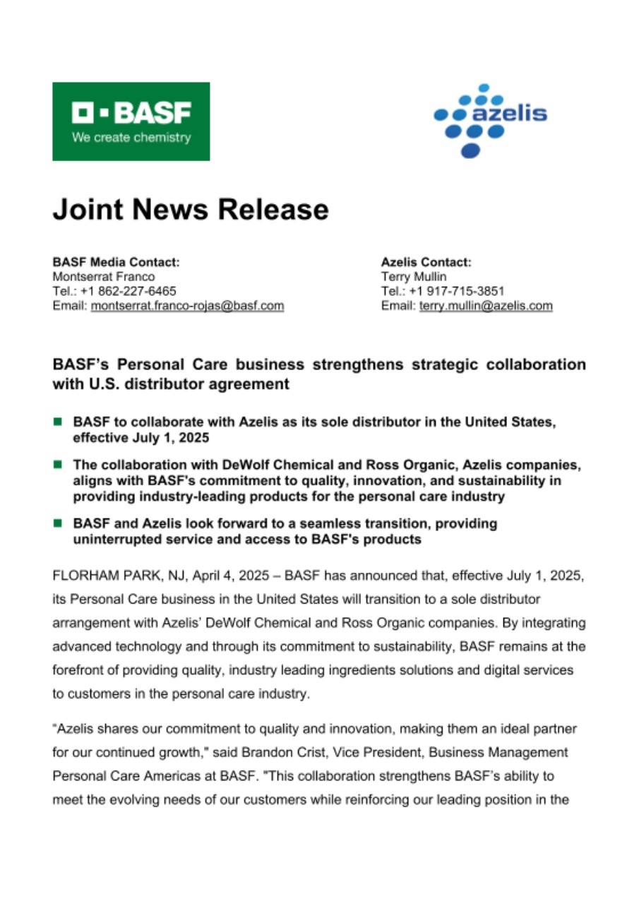 - The collaboration with DeWolf Chemical and Ross Organic, Azelis companies, aligns with BASF's commitment to quality, innovation, and sustainability in providing industry-leading products for the personal care industry