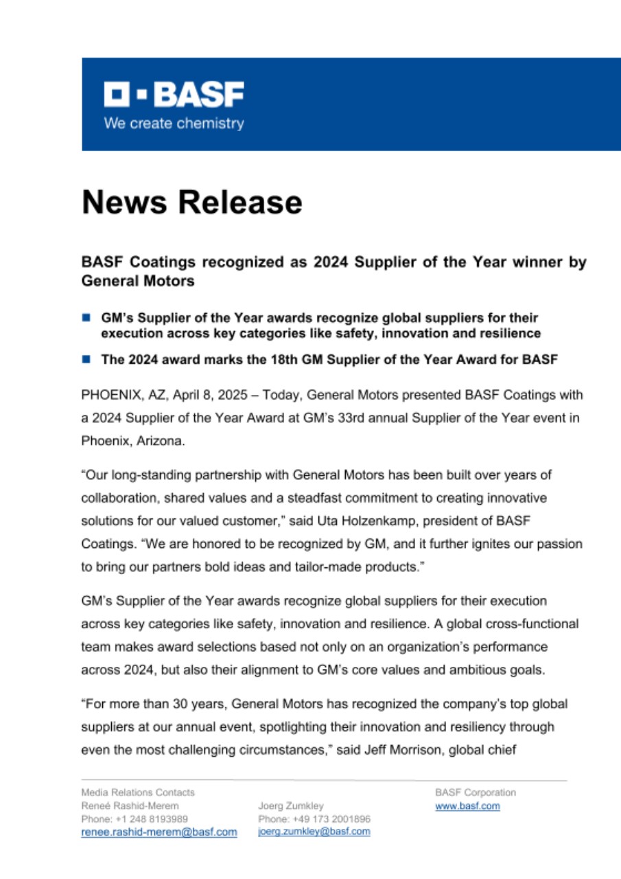 “Our long-standing partnership with General Motors has been built over years of collaboration, shared values and a steadfast commitment to creating innovative solutions for our valued customer,” said Uta Holzenkamp, president of BASF Coatings. “We are honored to be recognized by GM, and it further ignites our passion to bring our partners bold ideas and tailor-made products.”