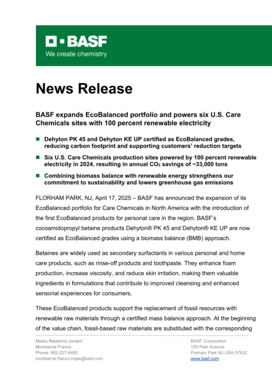 FLORHAM PARK, NJ, April 17, 2025 – BASF has announced the expansion of its EcoBalanced portfolio for Care Chemicals in North America with the introduction of the first EcoBalanced products for personal care in the region. BASF’s cocoamidopropyl betaine products Dehyton® PK 45 and Dehyton® KE UP are now certified as EcoBalanced grades using a biomass balance (BMB) approach.