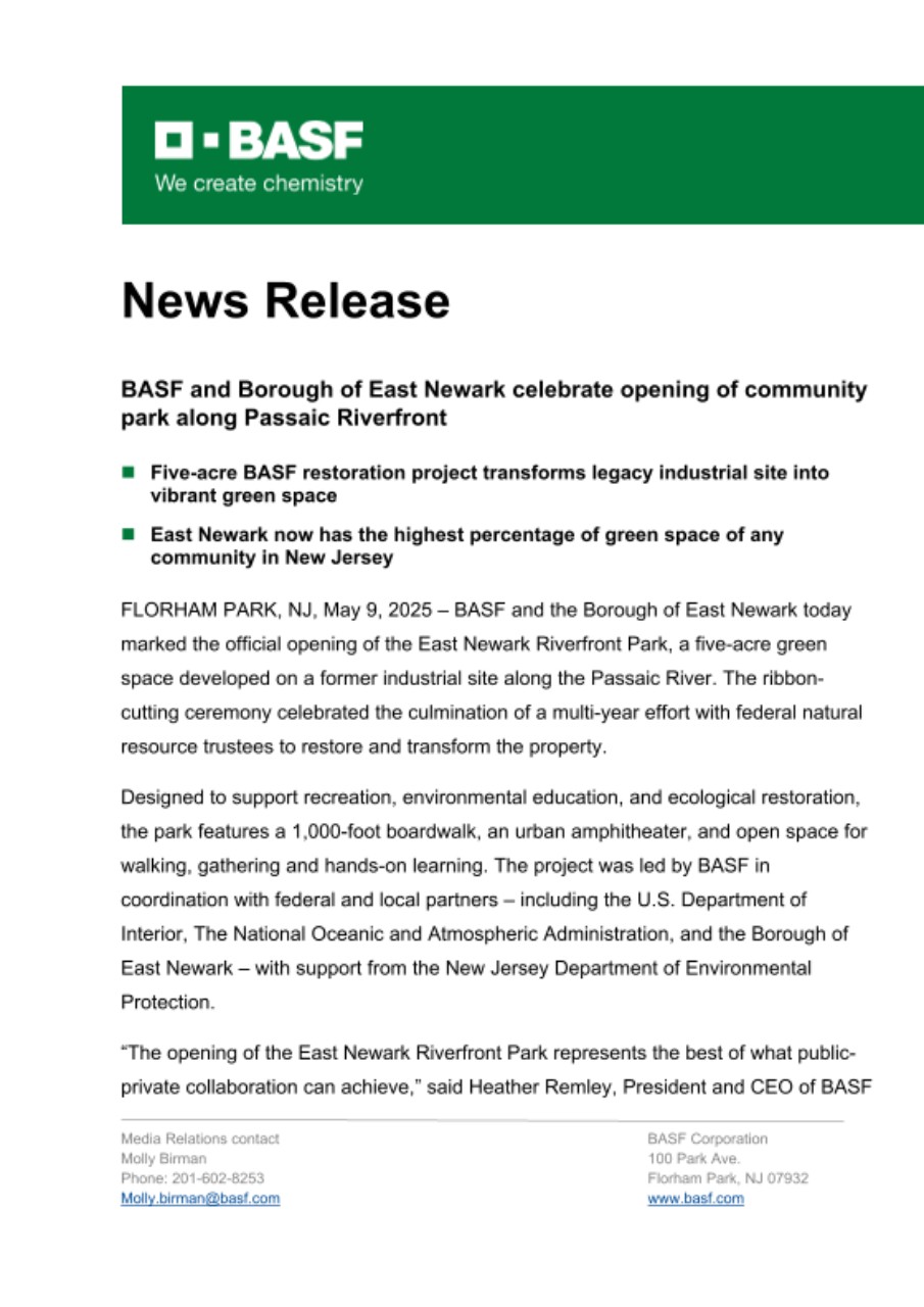FLORHAM PARK, NJ, May 9, 2025 – BASF and the Borough of East Newark today marked the official opening of the East Newark Riverfront Park, a five-acre green space developed on a former industrial site along the Passaic River. The ribbon-cutting ceremony celebrated the culmination of a multi-year effort with federal natural resource trustees to restore and transform the property.
