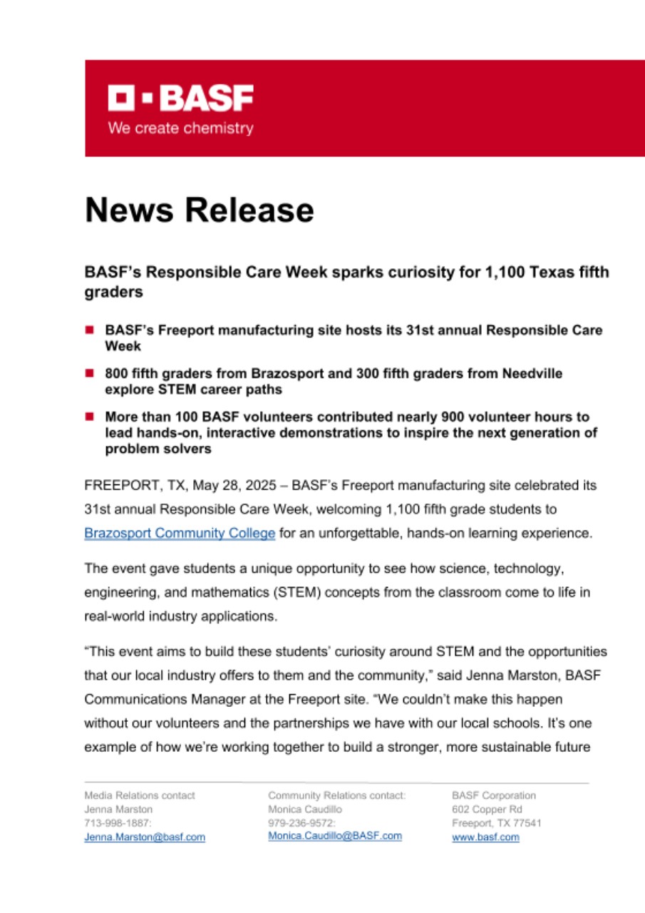 - BASF’s Freeport manufacturing site hosts its 31st annual Responsible Care Week