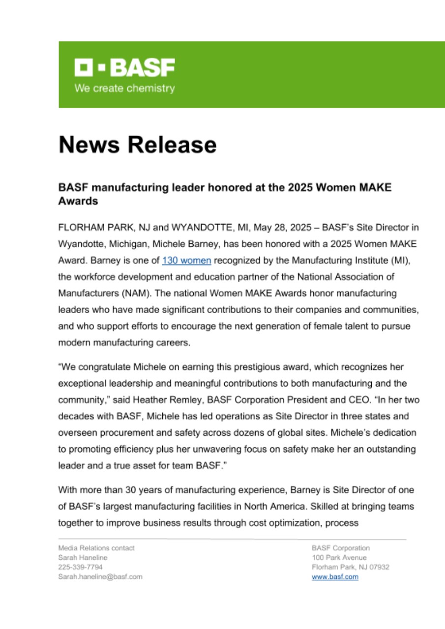 FLORHAM PARK, NJ and WYANDOTTE, MI, May 28, 2025 – BASF’s Site Director in Wyandotte, Michigan, Michele Barney, has been honored with a 2025 Women MAKE Award. Barney is one of 130 women recognized by the Manufacturing Institute (MI), the workforce development and education partner of the National Association of Manufacturers (NAM). The national Women MAKE Awards honor manufacturing leaders who have made significant contributions to their companies and communities, and who support efforts to encourage the next generation of female talent to pursue modern manufacturing careers.