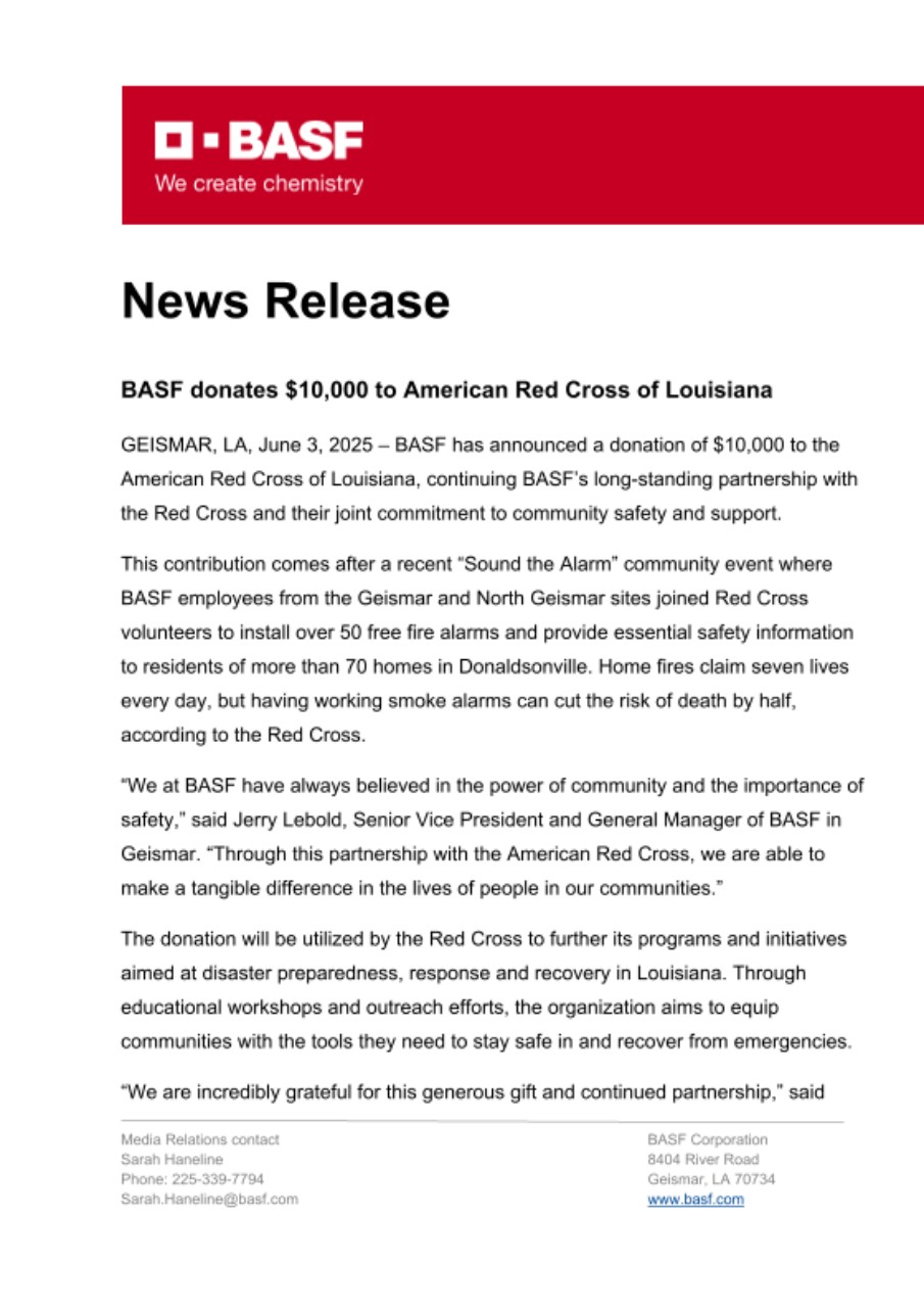 “We at BASF have always believed in the power of community and the importance of safety,” said Jerry Lebold, Senior Vice President and General Manager of BASF in Geismar. “Through this partnership with the American Red Cross, we are able to make a tangible difference in the lives of people in our communities.”