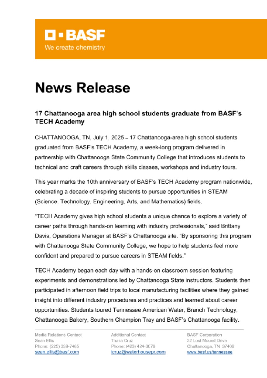 “TECH Academy gives high school students a unique chance to explore a variety of career paths through hands-on learning with industry professionals,” said Brittany Davis, Operations Manager at BASF’s Chattanooga site. “By sponsoring this program with Chattanooga State Community College, we hope to help students feel more confident and prepared to pursue careers in STEAM fields.”