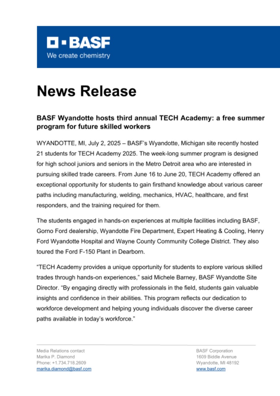 “TECH Academy provides a unique opportunity for students to explore various skilled trades through hands-on experiences,” said Michele Barney, BASF Wyandotte Site Director. “By engaging directly with professionals in the field, students gain valuable insights and confidence in their abilities. This program reflects our dedication to workforce development and helping young individuals discover the diverse career paths available in today’s workforce.”
