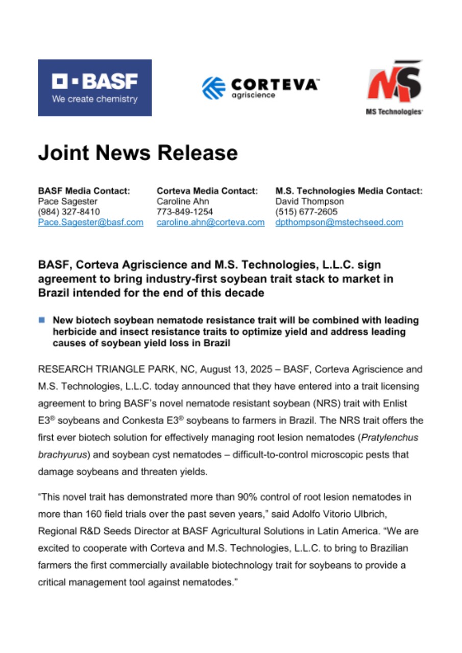 RESEARCH TRIANGLE PARK, NC, August 13, 2025 – BASF, Corteva Agriscience and M.S. Technologies, L.L.C. today announced that they have entered into a trait licensing agreement to bring BASF’s novel nematode resistant soybean (NRS) trait with Enlist E3® soybeans and Conkesta E3® soybeans to farmers in Brazil. The NRS trait offers the first ever biotech solution for effectively managing root lesion nematodes (Pratylenchus brachyurus) and soybean cyst nematodes – difficult-to-control microscopic pests that damage soybeans and threaten yields.