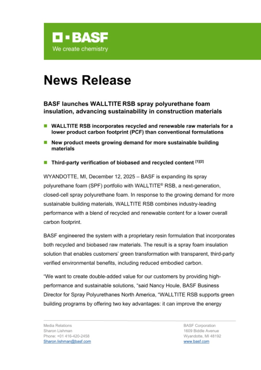 WYANDOTTE, MI, December 12, 2025 – BASF is expanding its spray polyurethane foam (SPF) portfolio with WALLTITE® RSB, a next-generation, closed-cell spray polyurethane foam. In response to the growing demand for more sustainable building materials, WALLTITE RSB combines industry-leading performance with a blend of recycled and renewable content for a lower overall carbon footprint.