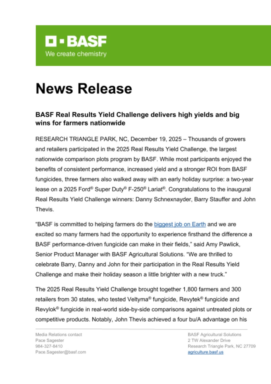 “BASF is committed to helping farmers do the biggest job on Earth and we are excited so many farmers had the opportunity to experience firsthand the difference a BASF performance-driven fungicide can make in their fields,” said Amy Pawlick, Senior Product Manager with BASF Agricultural Solutions. “We are thrilled to celebrate Barry, Danny and John for their participation in the Real Results Yield Challenge and make their holiday season a little brighter with a new truck.”