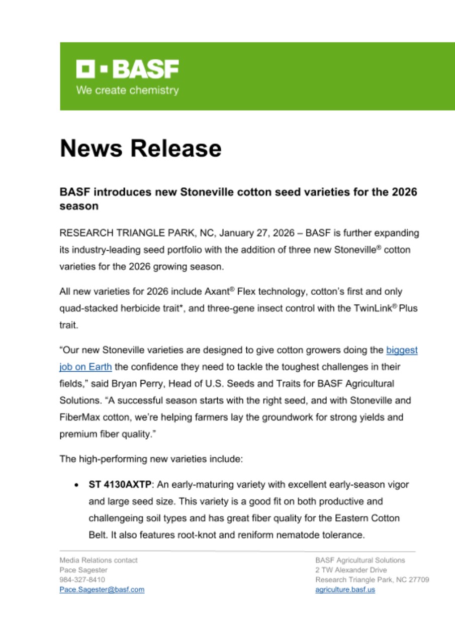 RESEARCH TRIANGLE PARK, NC, January 27, 2026 – BASF is further expanding its industry-leading seed portfolio with the addition of three new Stoneville® cotton varieties for the 2026 growing season.