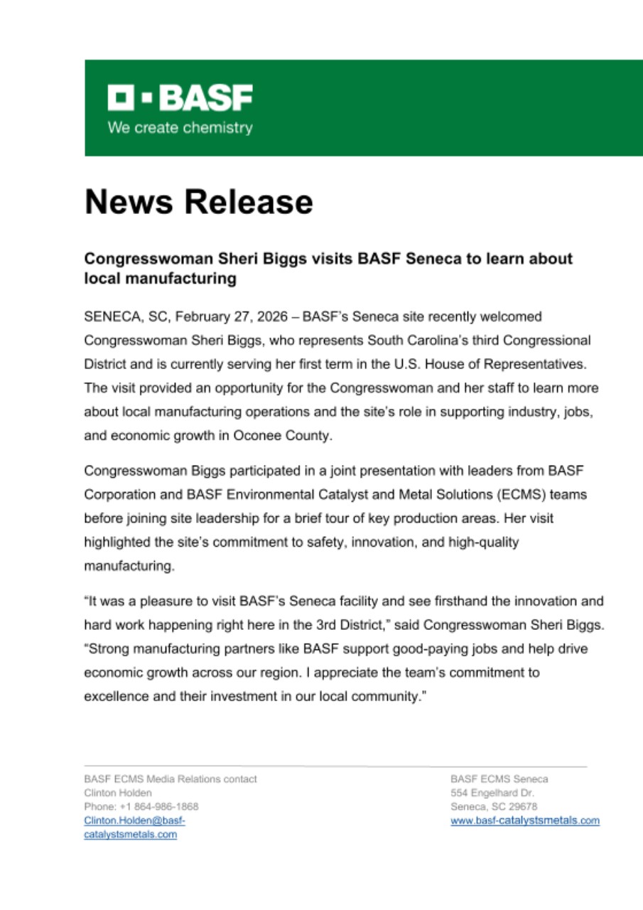 “It was a pleasure to visit BASF’s Seneca facility and see firsthand the innovation and hard work happening right here in the 3rd District,” said Congresswoman Sheri Biggs. “Strong manufacturing partners like BASF support good-paying jobs and help drive economic growth across our region. I appreciate the team’s commitment to excellence and their investment in our local community.”