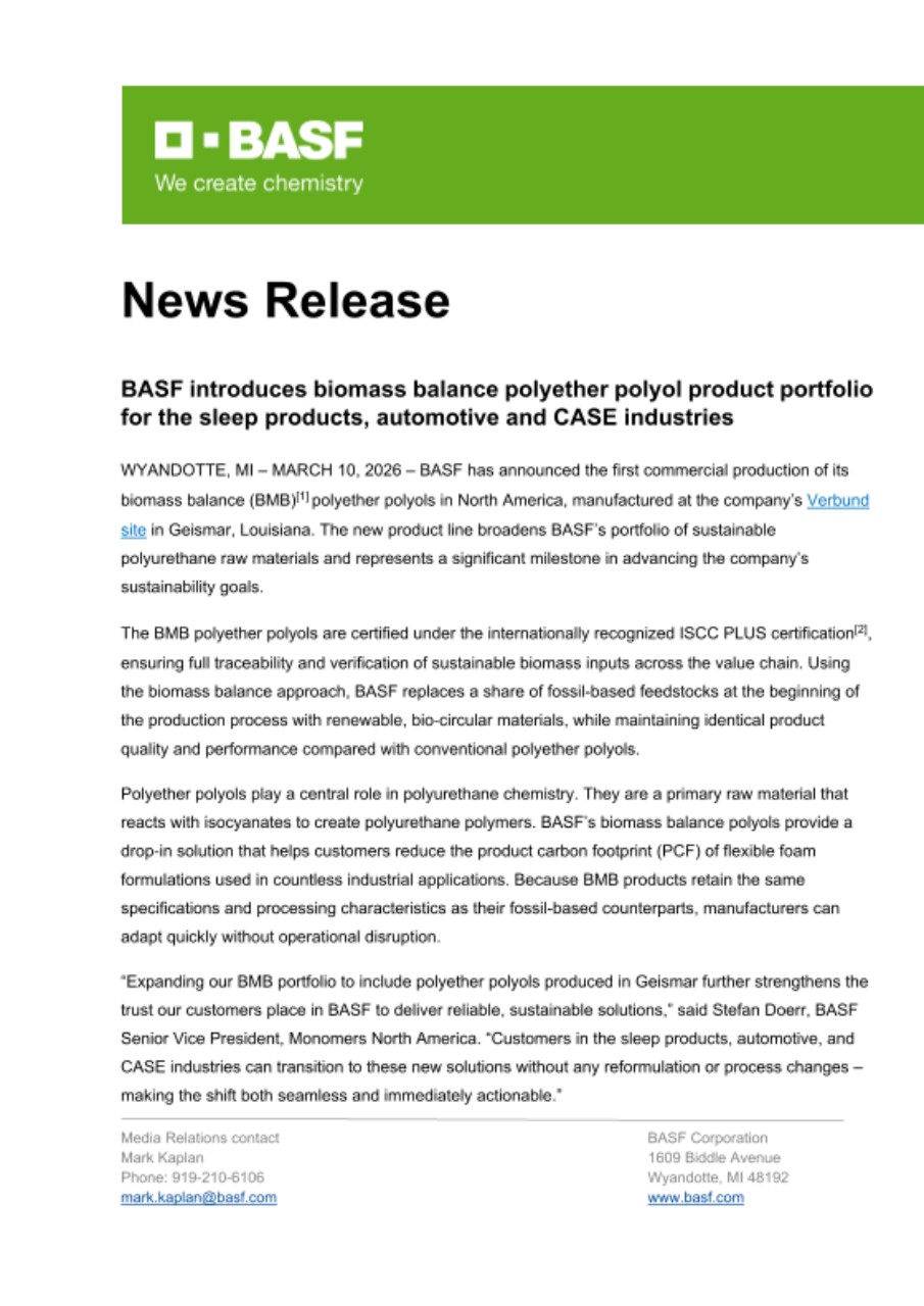 “Expanding our BMB portfolio to include polyether polyols produced in Geismar further strengthens the trust our customers place in BASF to deliver reliable, sustainable solutions,” said Stefan Doerr, BASF Senior Vice President, Monomers North America. “Customers in the sleep products, automotive, and CASE industries can transition to these new solutions without any reformulation or process changes – making the shift both seamless and immediately actionable.”