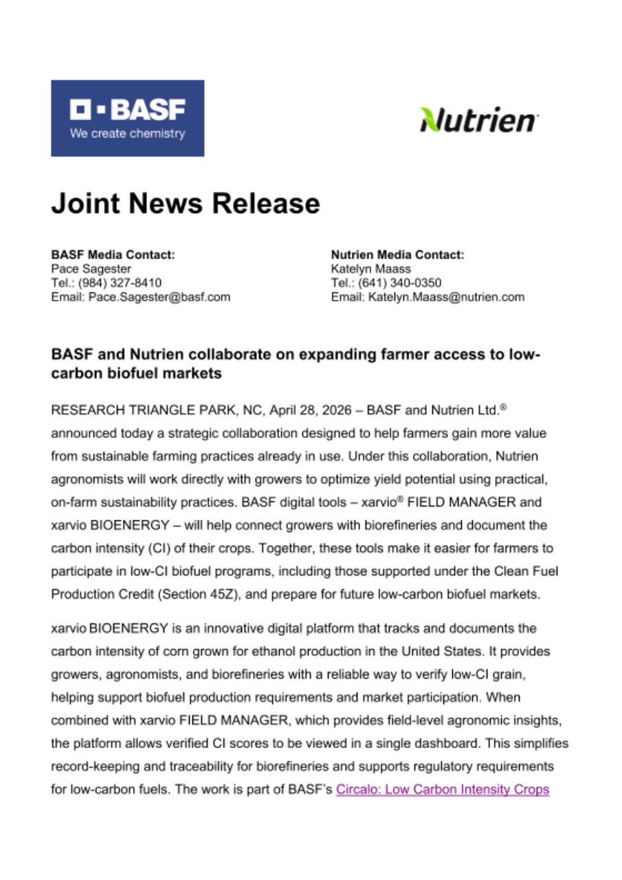 RESEARCH TRIANGLE PARK, NC, April 28, 2026 – BASF and Nutrien Ltd.® announced today a strategic collaboration designed to help farmers gain more value from sustainable farming practices already in use. Under this collaboration, Nutrien agronomists will work directly with growers to optimize yield potential using practical, on-farm sustainability practices. BASF digital tools – xarvio® FIELD MANAGER and xarvio BIOENERGY – will help connect growers with biorefineries and document the carbon intensity (CI) of their crops. Together, these tools make it easier for farmers to participate in low-CI biofuel programs, including those supported under the Clean Fuel Production Credit (Section 45Z), and prepare for future low-carbon biofuel markets.