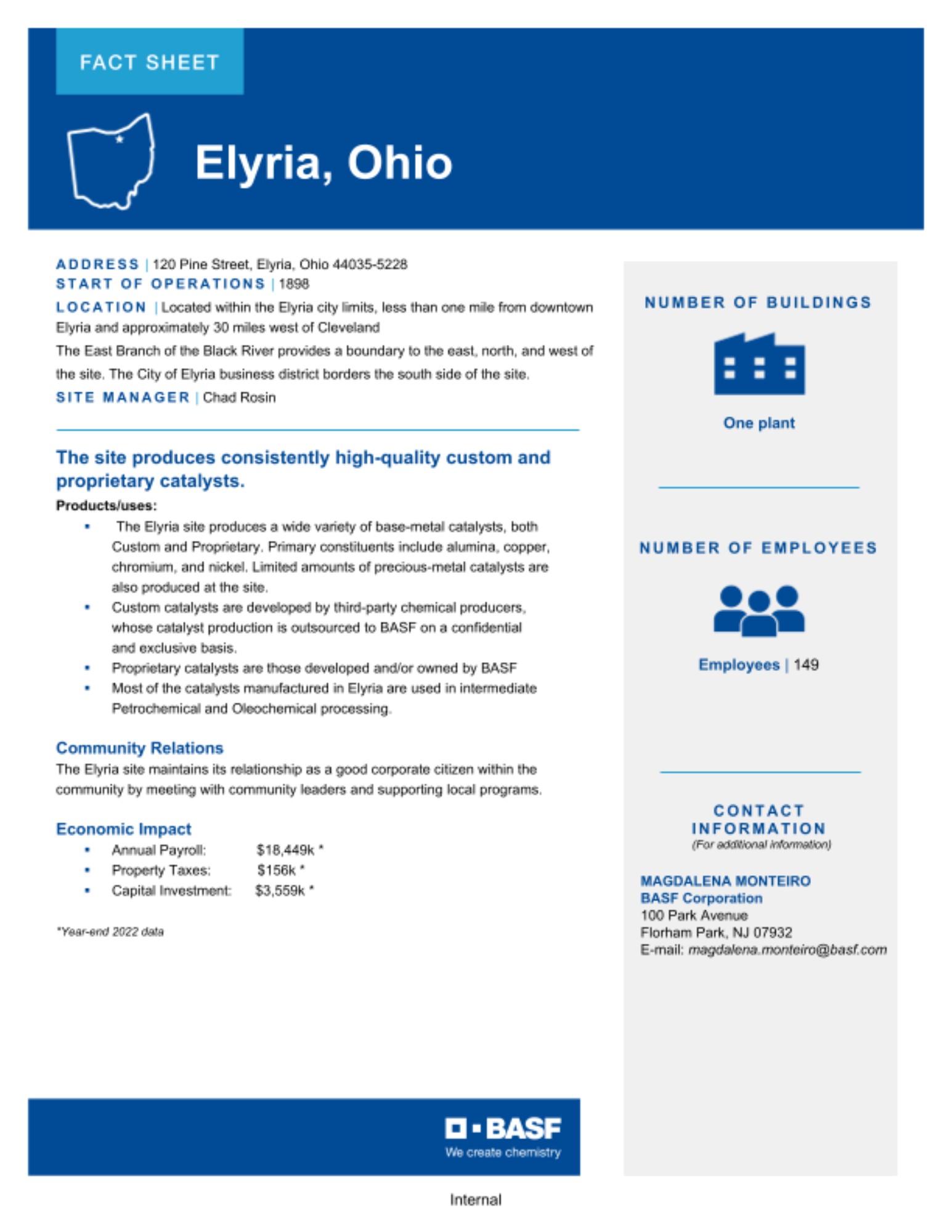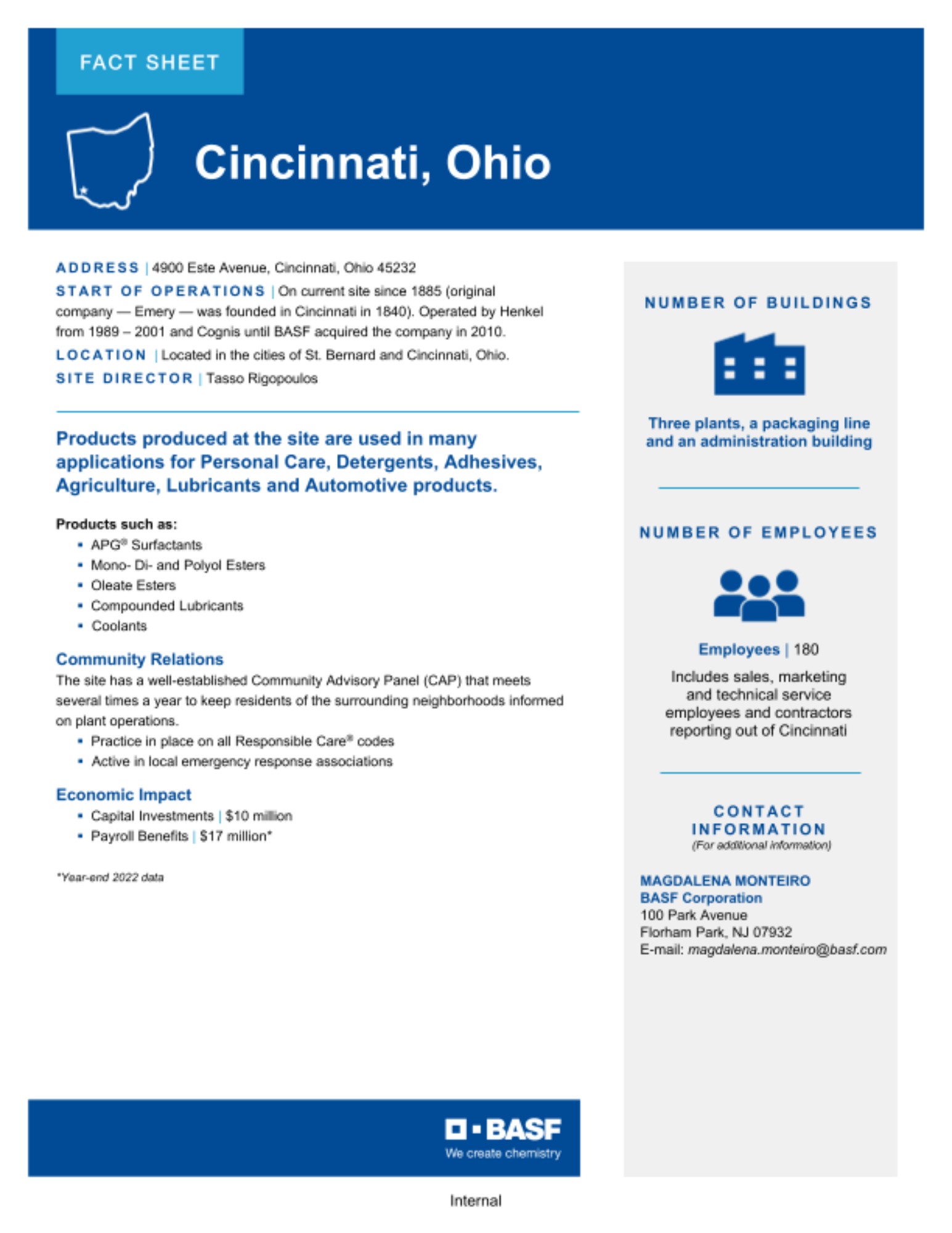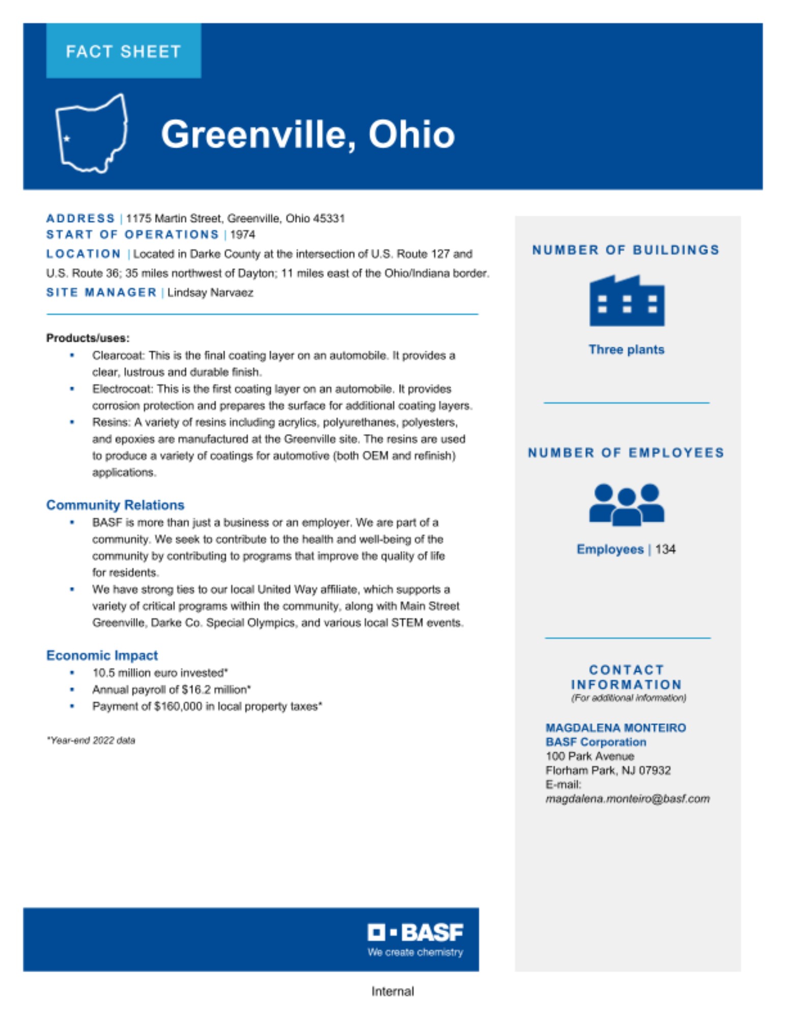 BASF’s presence in Ohio includes operations in Beachwood, Cincinnati, Greenville, Elyria, Lima and Whitehouse.