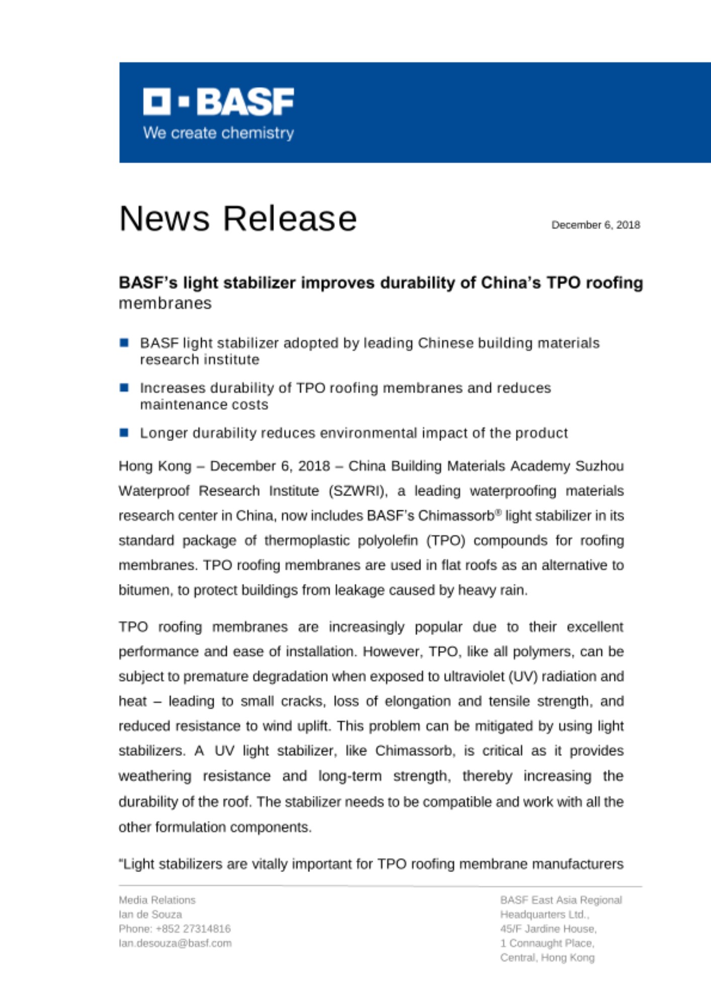 Hong Kong – December 6, 2018 – China Building Materials Academy Suzhou Waterproof Research Institute (SZWRI), a leading waterproofing materials research center in China, now includes BASF’s Chimassorb® light stabilizer in its standard package of thermoplastic polyolefin (TPO) compounds for roofing membranes. TPO roofing membranes are used in flat roofs as an alternative to bitumen, to protect buildings from leakage caused by heavy rain.