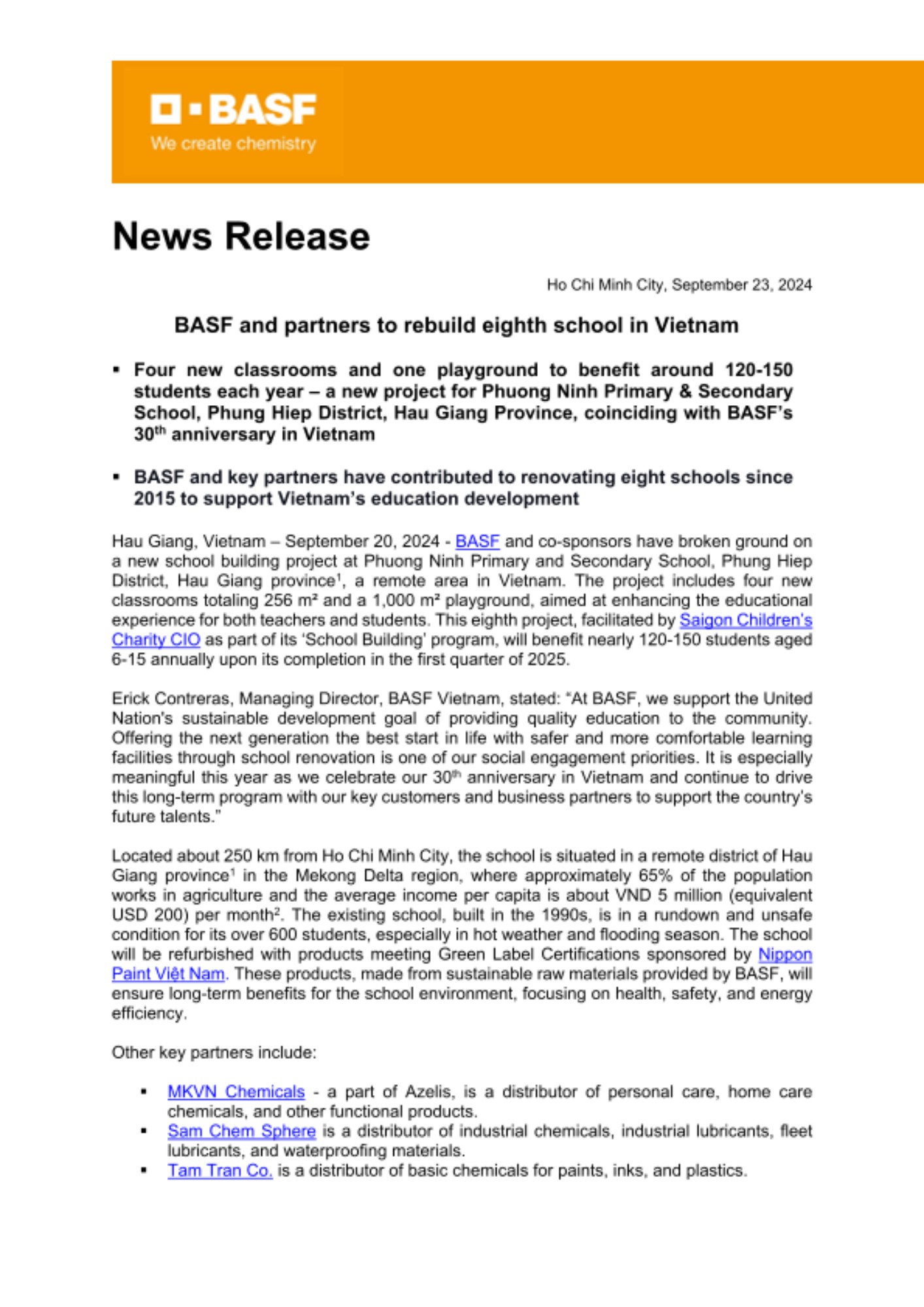 Erick Contreras, Managing Director, BASF Vietnam, stated: “At BASF, we support the United Nation's sustainable development goal of providing quality education to the community. Offering the next generation the best start in life with safer and more comfortable learning facilities through school renovation is one of our social engagement priorities. It is especially meaningful this year as we celebrate our 30th anniversary in Vietnam and continue to drive this long-term program with our key customers and business partners to support the country’s future talents.”