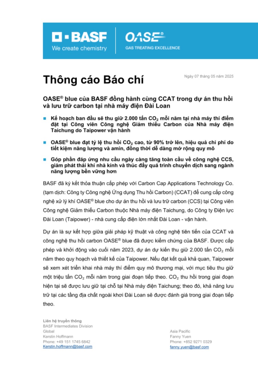 BASF đã ký kết thỏa thuận cấp phép với Carbon Cap Applications Technology Co. (tạm dịch: Công ty Công nghệ Ứng dụng Thu hồi Carbon) (CCAT) để cung cấp công nghệ xử lý khí OASE® blue cho dự án thu hồi và lưu trữ carbon (CCS) tại Công viên Công nghệ Giảm thiểu Carbon thuộc Nhà máy điện Taichung, do Công ty Điện lực Đài Loan (Taipower) - nhà cung cấp điện lớn nhất Đài Loan - vận hành.