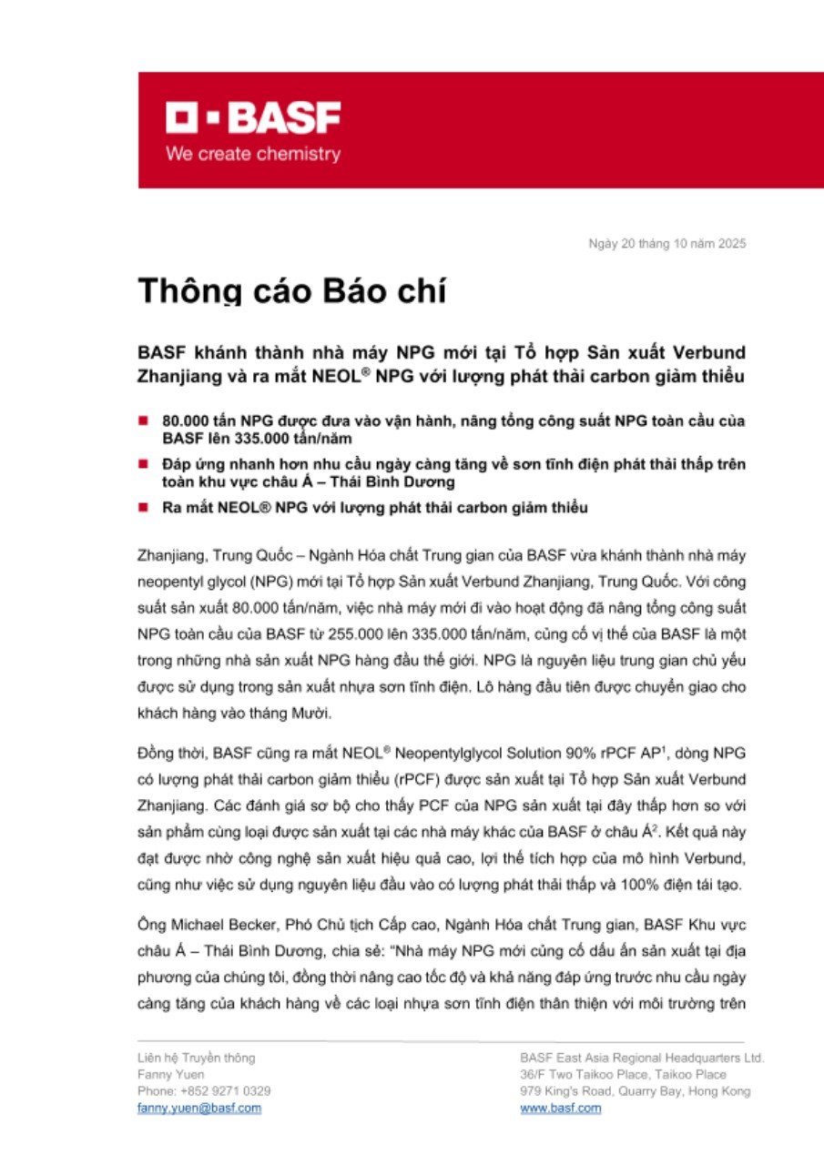 Đồng thời, BASF cũng ra mắt NEOL® Neopentylglycol Solution 90% rPCF AP1, dòng NPG có lượng phát thải carbon giảm thiểu (rPCF) được sản xuất tại Tổ hợp Sản xuất Verbund Zhanjiang. Các đánh giá sơ bộ cho thấy PCF của NPG sản xuất tại đây thấp hơn so với sản phẩm cùng loại được sản xuất tại các nhà máy khác của BASF ở châu Á2. Kết quả này đạt được nhờ công nghệ sản xuất hiệu quả cao, lợi thế tích hợp của mô hình Verbund, cũng như việc sử dụng nguyên liệu đầu vào có lượng phát thải thấp và 100% điện tái tạo.