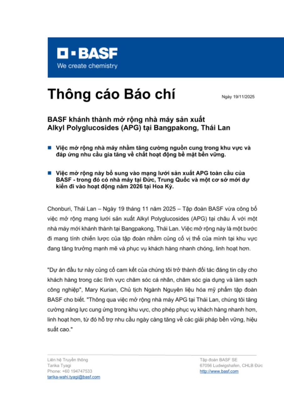 Chonburi, Thái Lan – Ngày 19 tháng 11 năm 2025 – Tập đoàn BASF vừa công bố việc mở rộng mạng lưới sản xuất Alkyl Polyglucosides (APG) tại châu Á với một nhà máy mới khánh thành tại Bangpakong, Thái Lan. Việc mở rộng này là một bước đi mang tính chiến lược của tập đoàn nhằm củng cố vị thế của mình tại khu vực đang tăng trưởng mạnh mẽ và phục vụ khách hàng nhanh chóng, linh hoạt hơn.