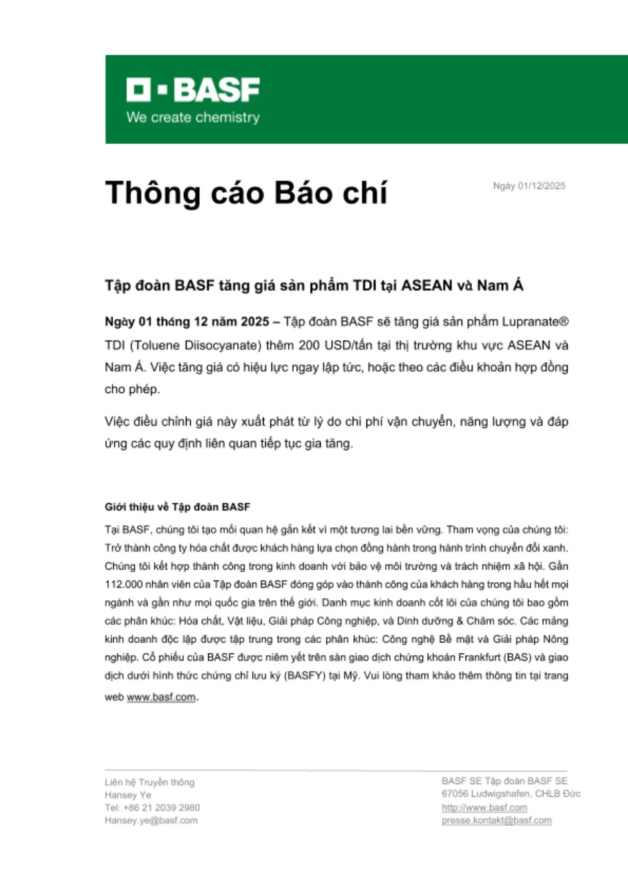 Ngày 01 tháng 12 năm 2025 – Tập đoàn BASF sẽ tăng giá sản phẩm Lupranate® TDI (Toluene Diisocyanate) thêm 200 USD/tấn tại thị trường khu vực ASEAN và Nam Á. Việc tăng giá có hiệu lực ngay lập tức, hoặc theo các điều khoản hợp đồng cho phép.