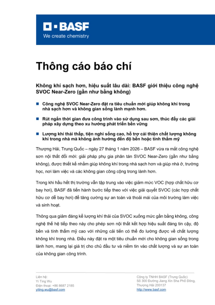 Thượng Hải, Trung Quốc – ngày 27 tháng 1 năm 2026 – BASF vừa ra mắt công nghệ sơn nội thất đổi mới: giải pháp phụ gia phân tán SVOC Near-Zero (gần như bằng không), được thiết kế nhằm giúp không khí trong nhà sạch hơn và giúp nhà ở, trường học, nơi làm việc và các không gian công cộng trong lành hơn.