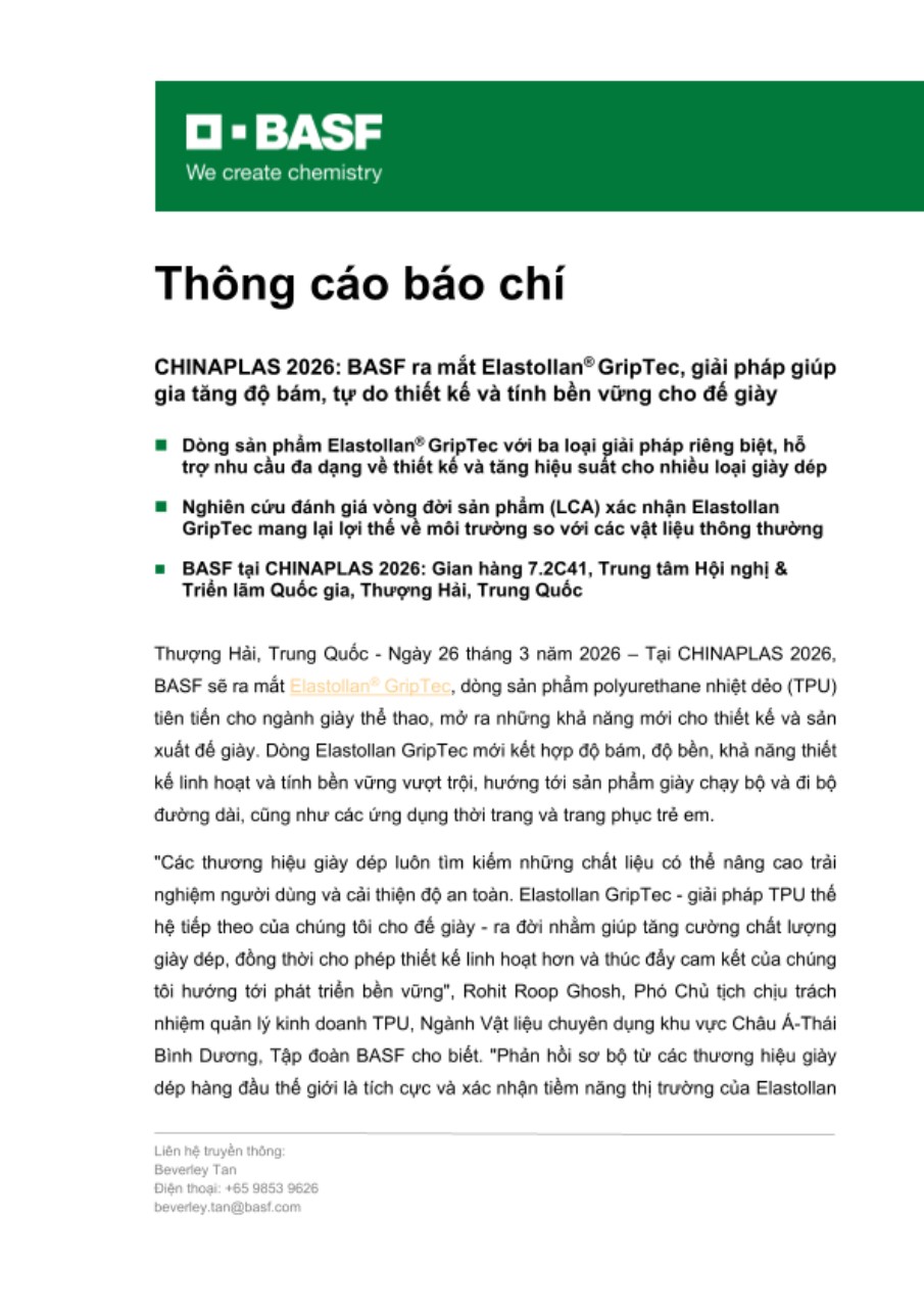CHINAPLAS 2026: BASF ra mắt Elastollan® GripTec, giải pháp giúp gia tăng độ bám, tự do thiết kế và tính bền vững cho đế giày